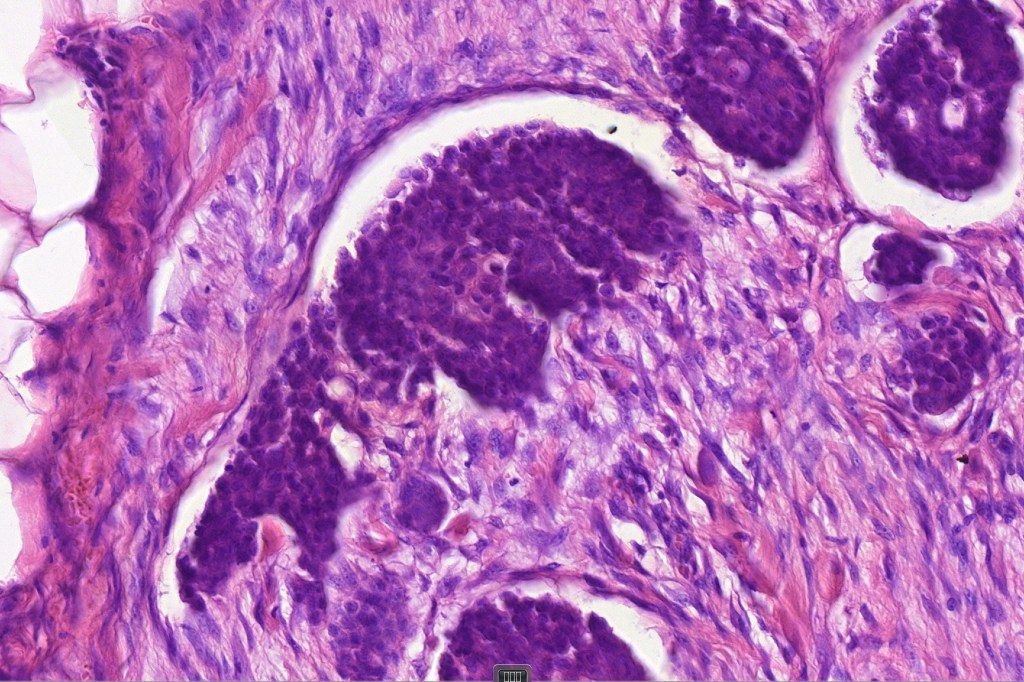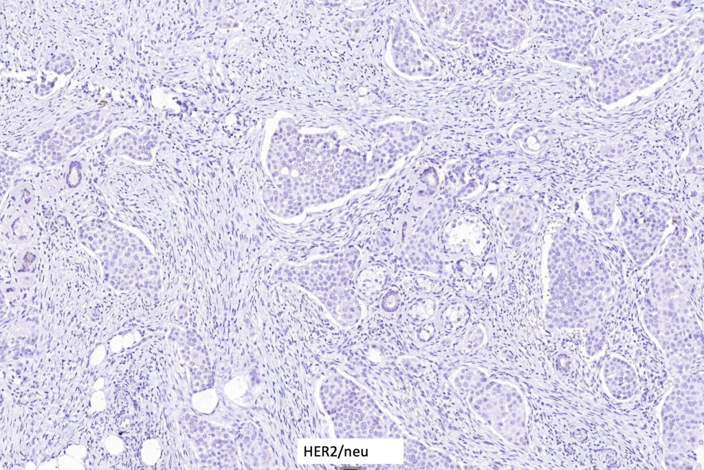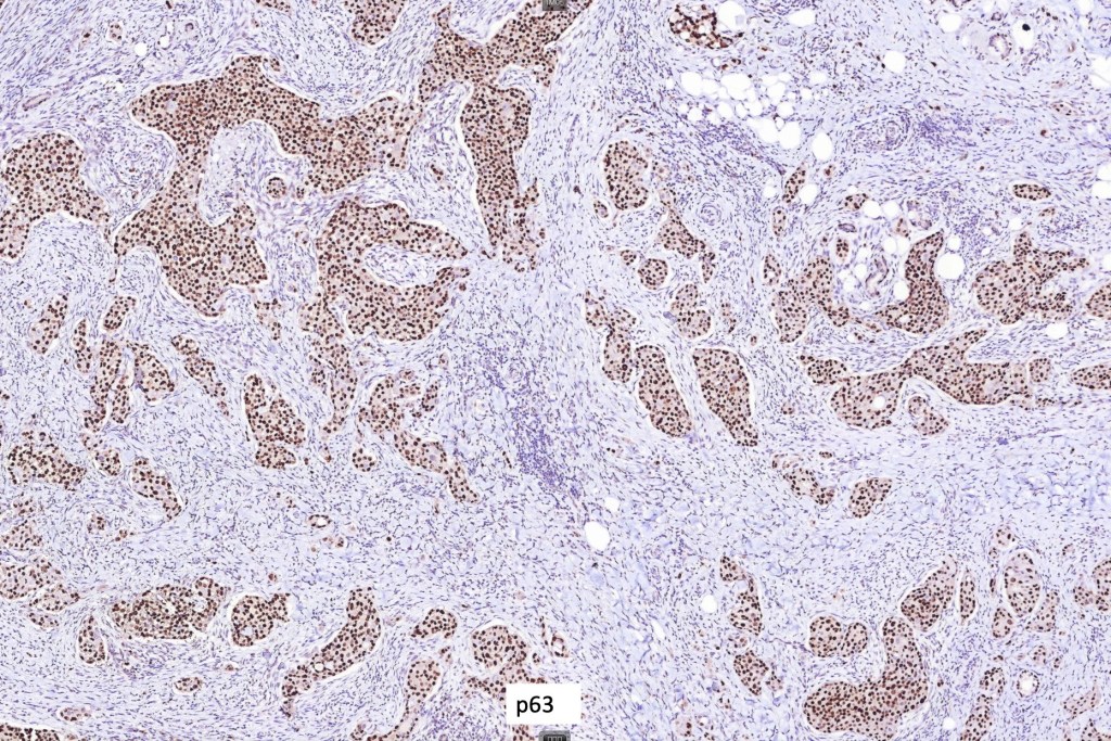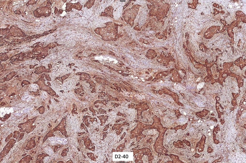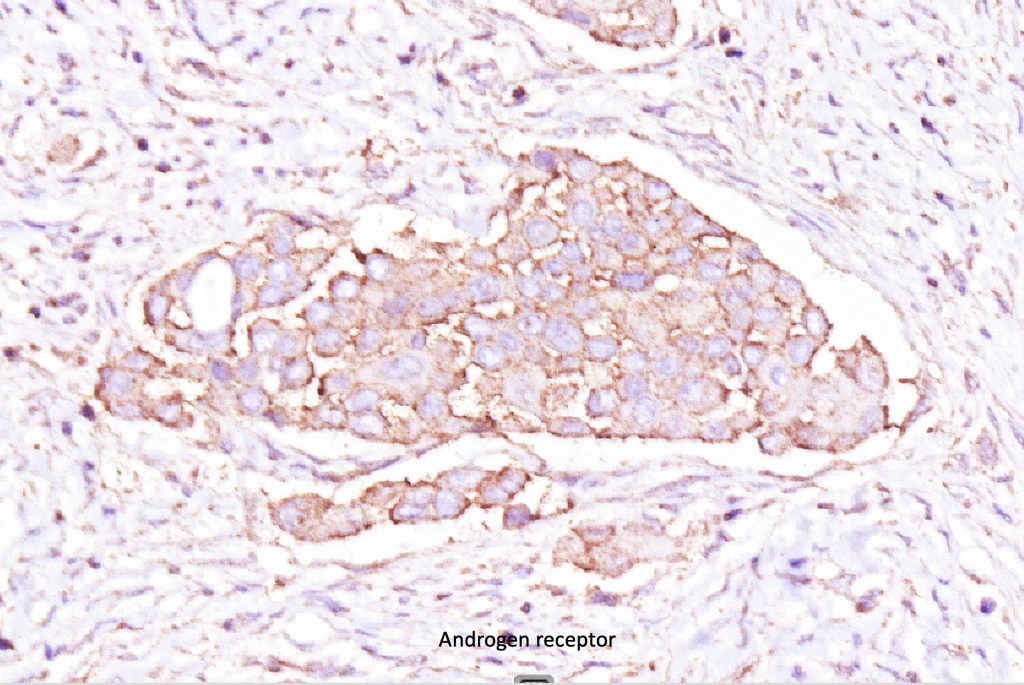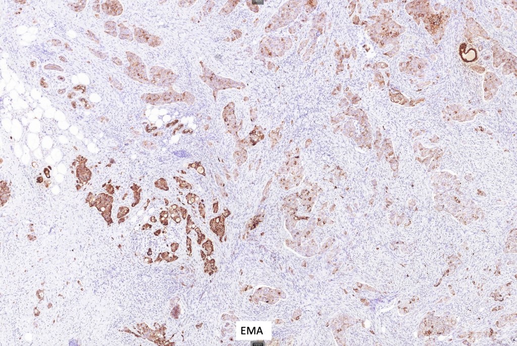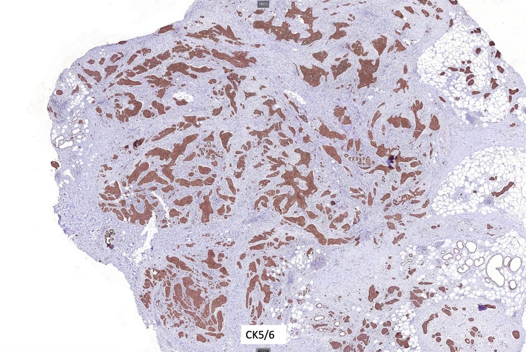 •CAM 5.2, AE1/AE3, CK5/6, EMA, CEA, GATA3, androgen receptor, GCDFP15 and D2-40 positive