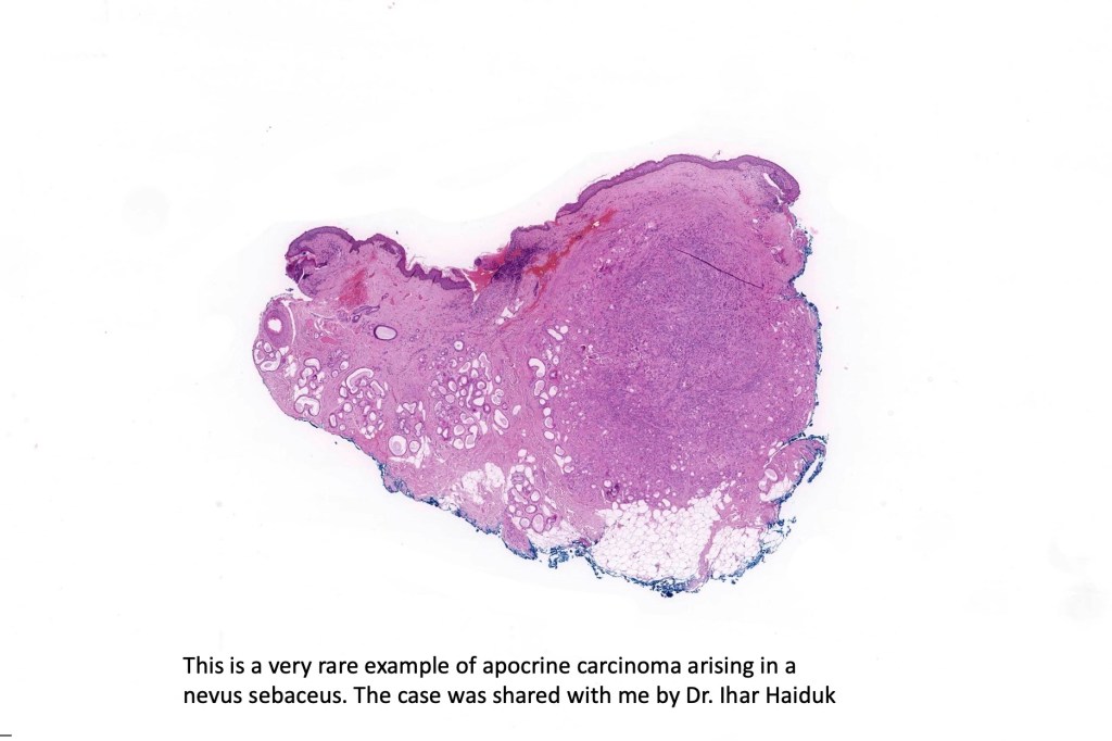 •Rarely develops in a nevus sebaceus or complicates a benign precursor apocrine tumor