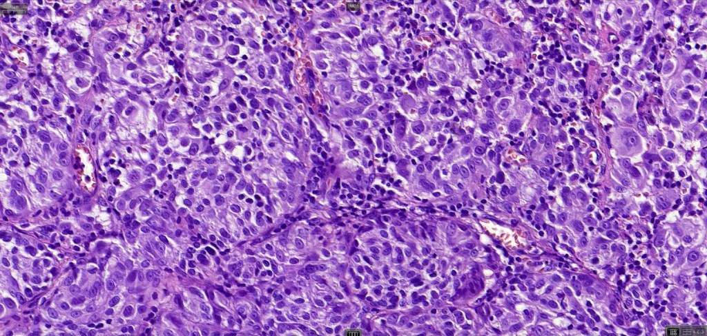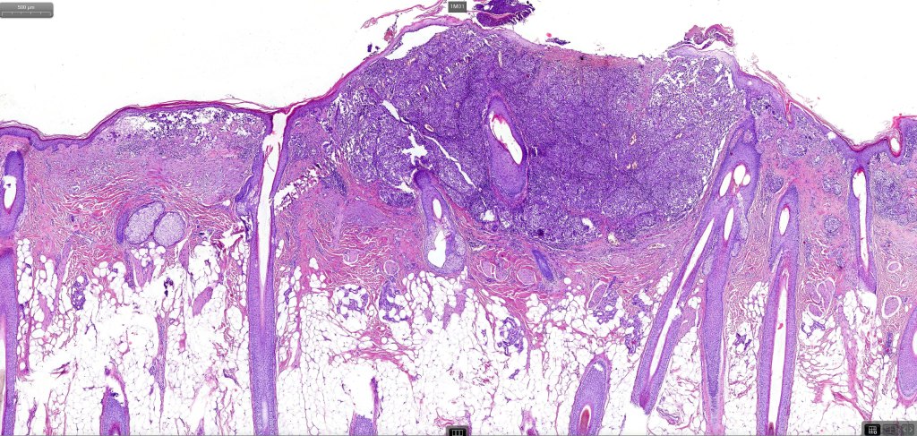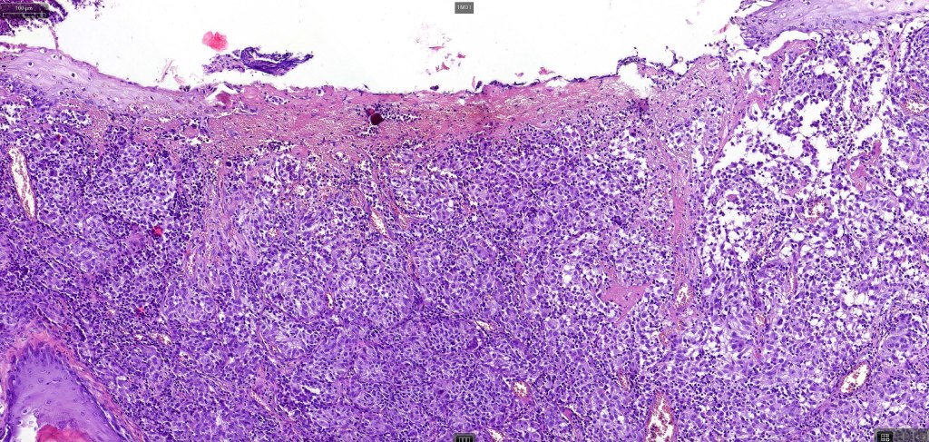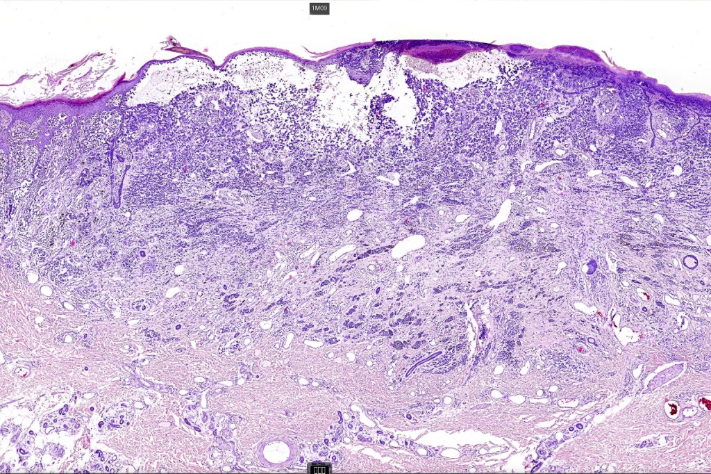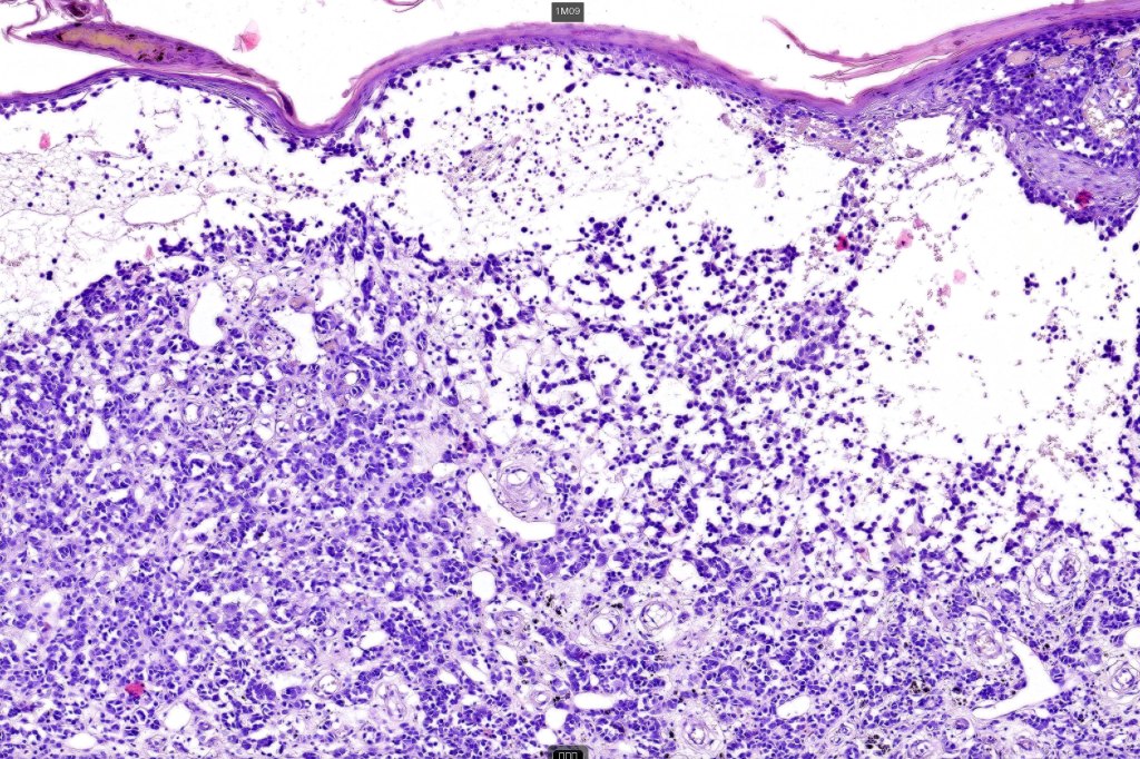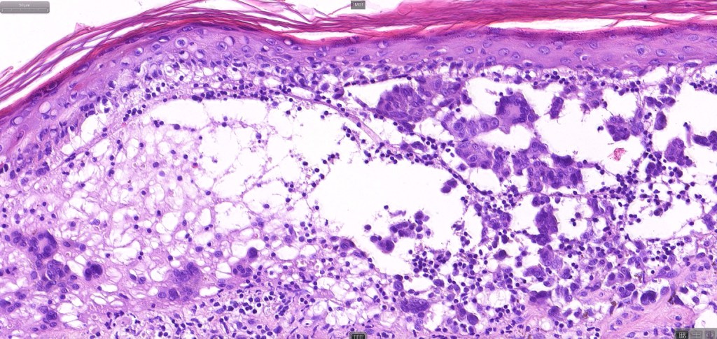 An exceedingly rare variant of melanoma. The term includes cases of melanoma that show features of an associated inherited bullous dermatosis such as epidermolysis bullosa or acquired immunobullous intraepidermal or sub epidermal bullous dermatosis such as pemphigus or bullous pemphigoid and cases where the blister develops directly overlying the melanoma in the absence of any underlying/associated blistering condition. It is generally recommended that measurement of the melanoma should be from taken below the blister/vesicle so as to avoid over-estimating tumor thickness.
