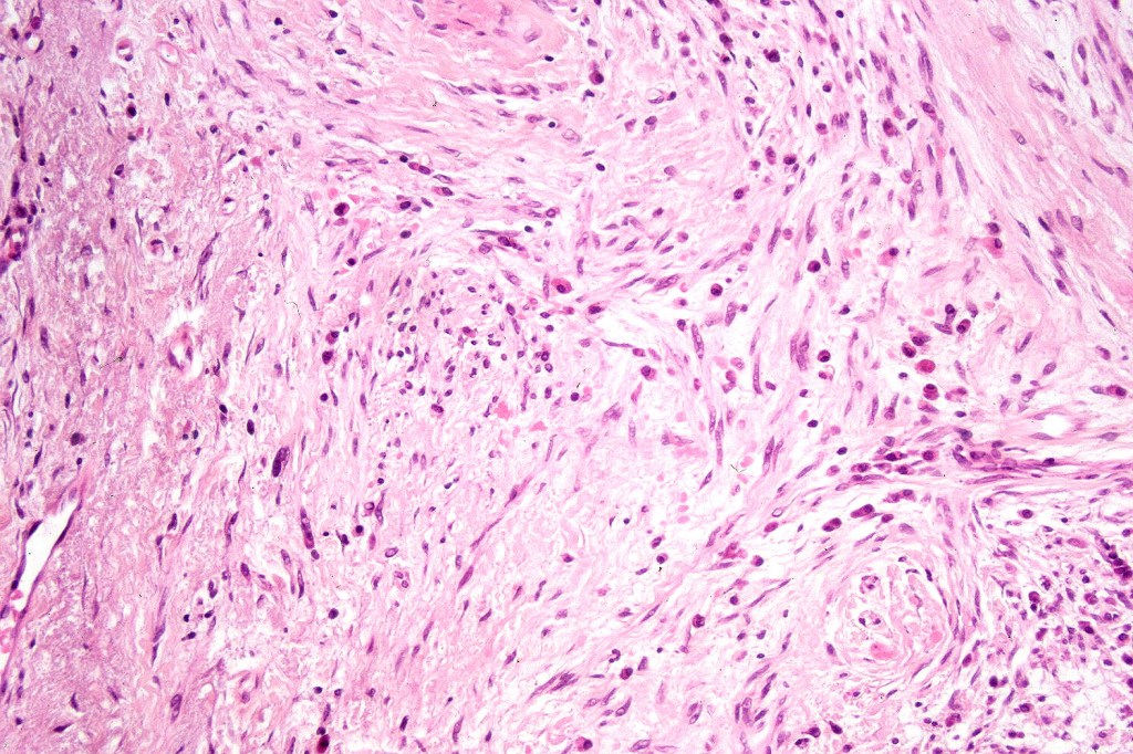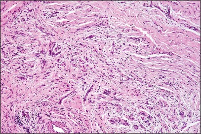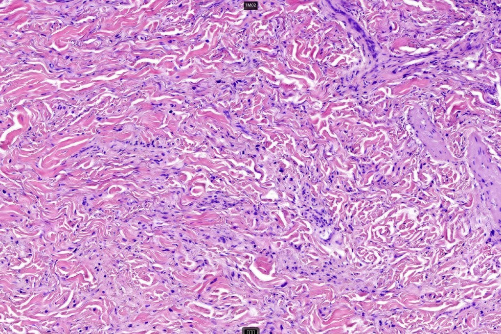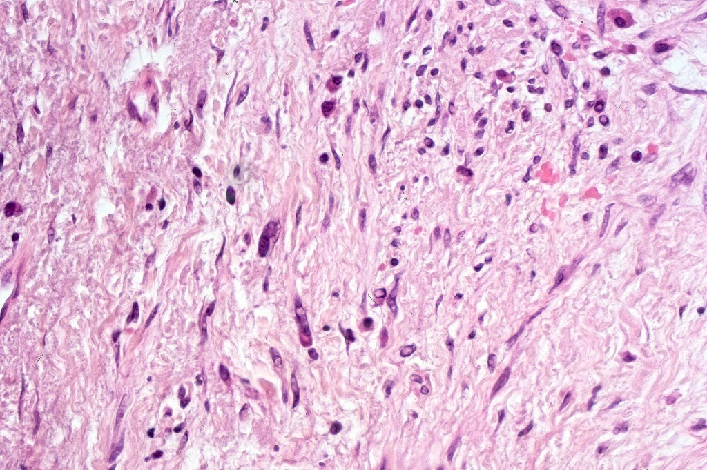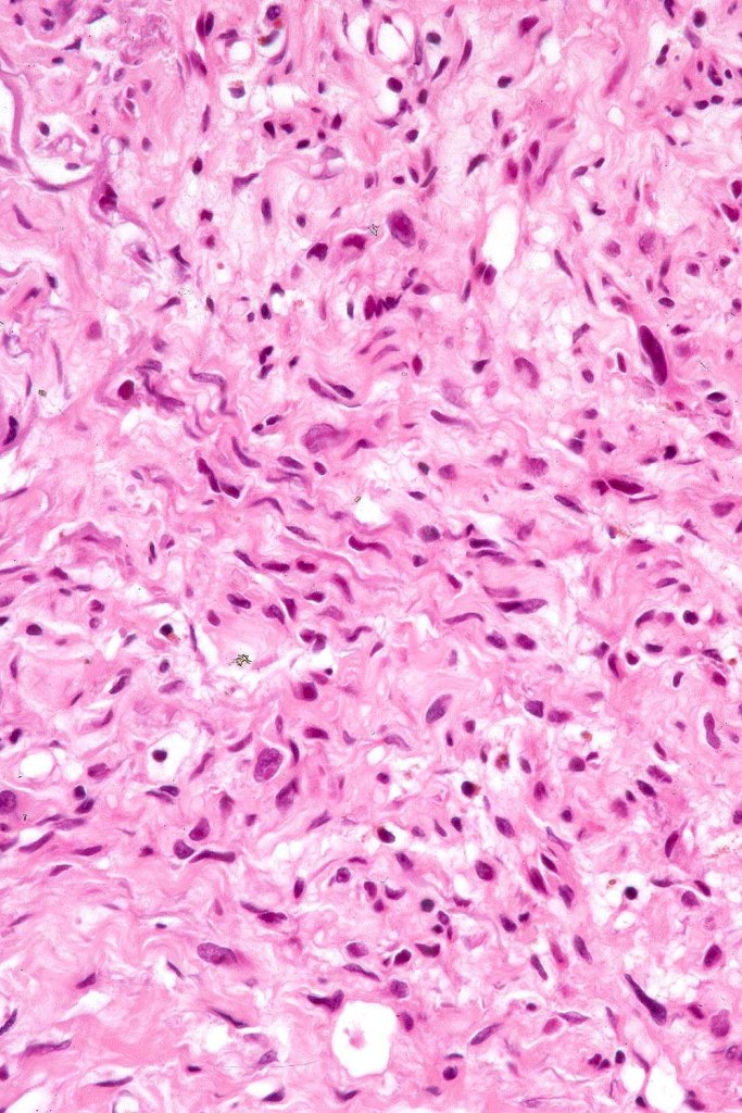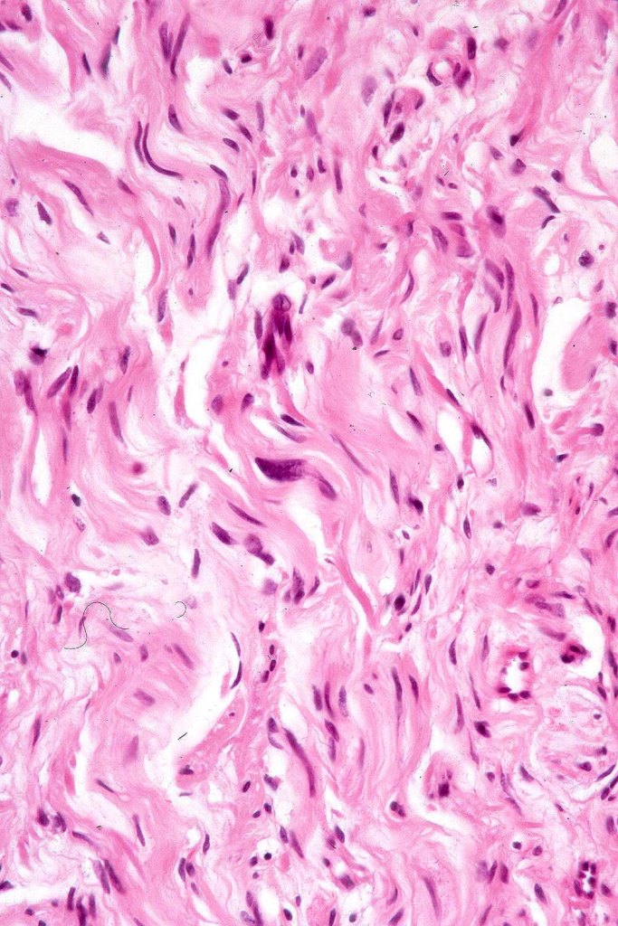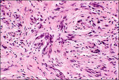•Paucicellular spindle cell infiltrate with “myxoid” fine to a dense collagenous stroma