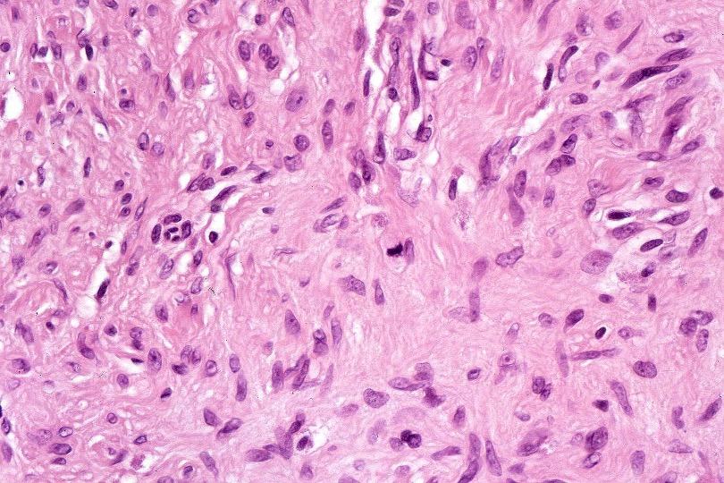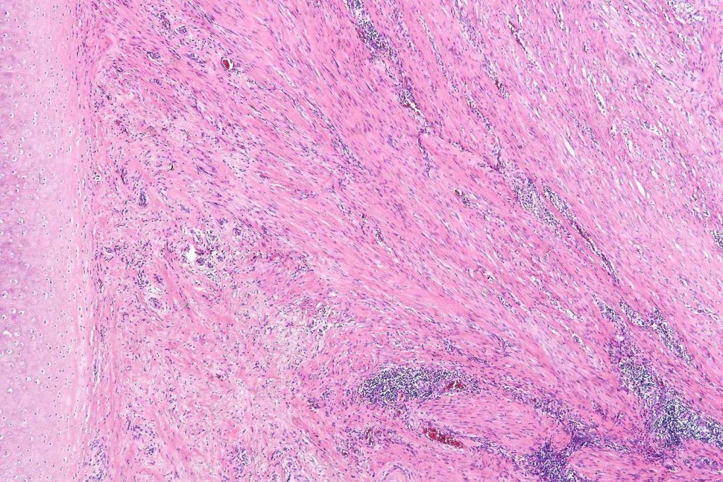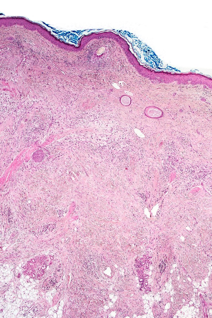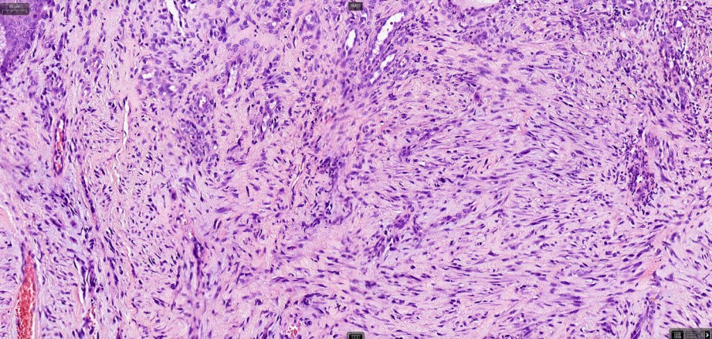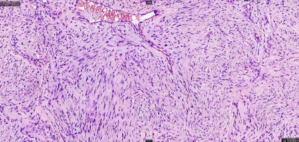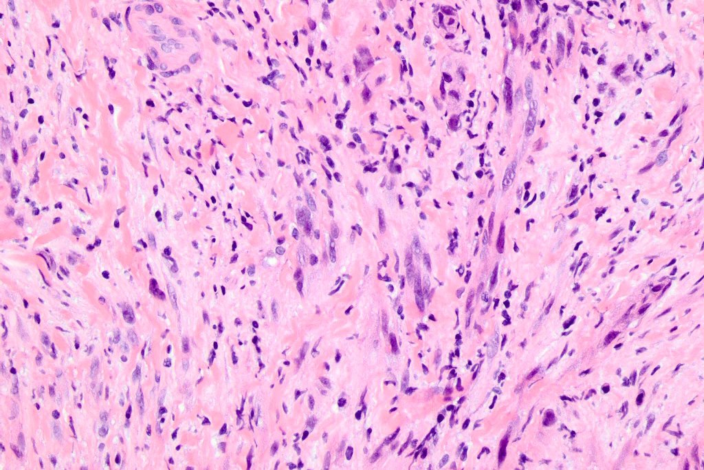 •Paucicellular spindle cell infiltrate with “myxoid” fine to a dense collagenous stroma