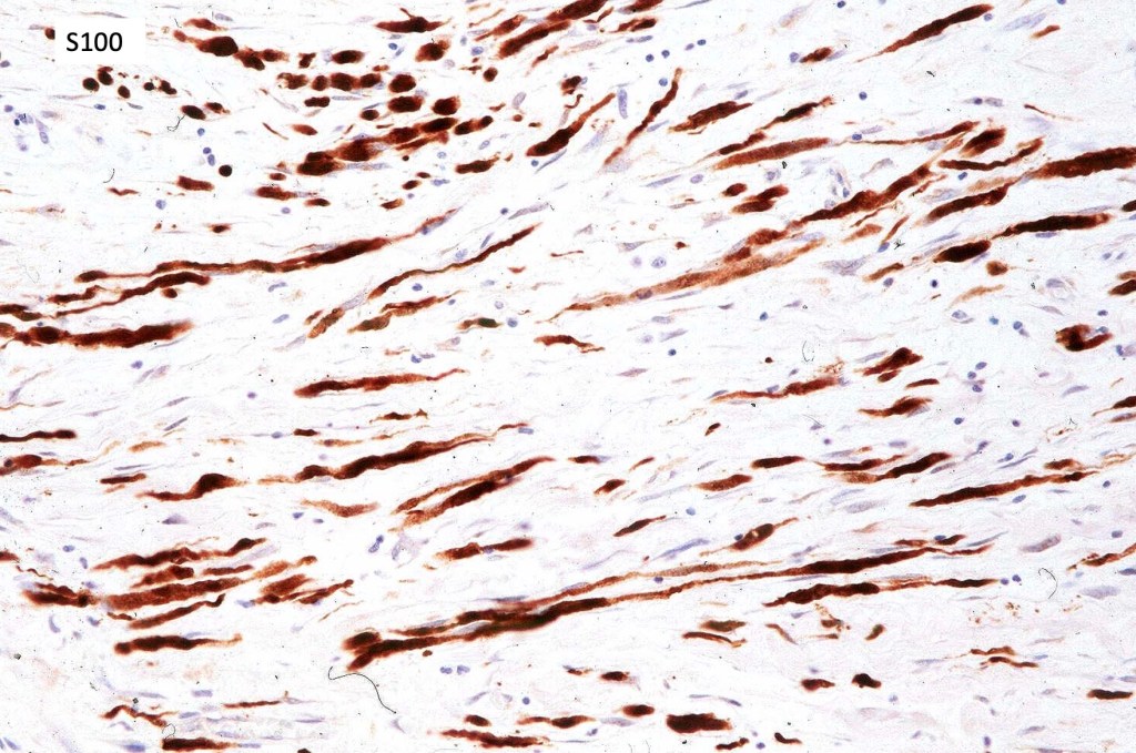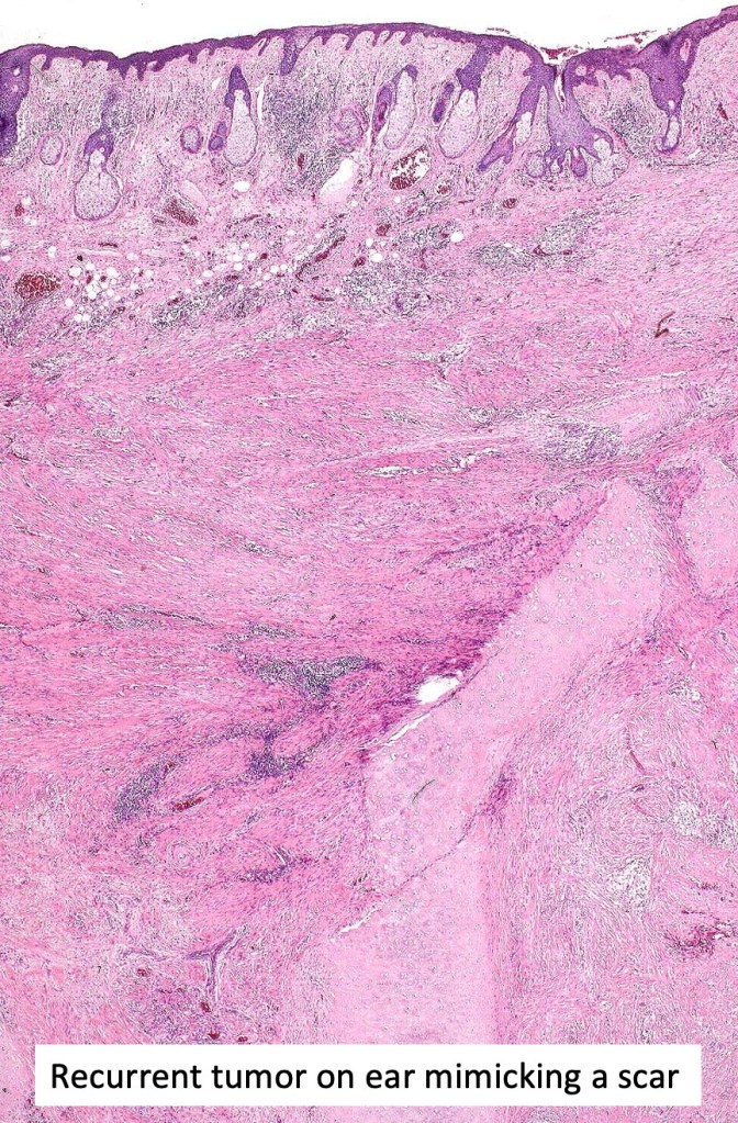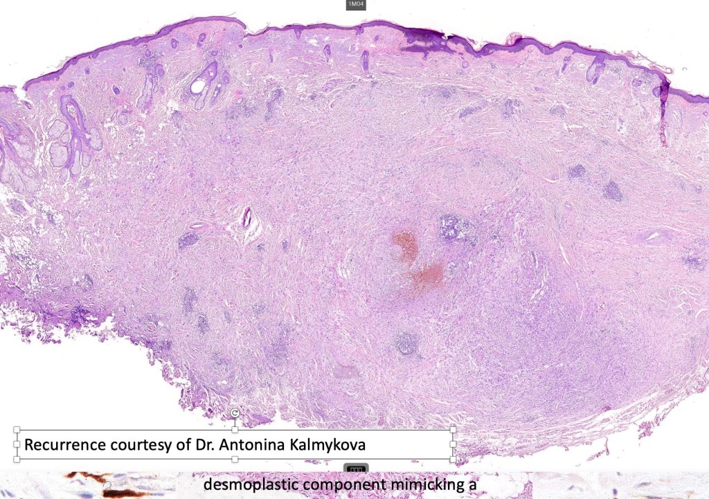Pure forms require a high index of suspicion and frequently IHC is required if a junctional component is not evident. Desmoplastic melanoma can be mistaken for a scar (never report on a scar if the clinical history doesn’t detail what the original lesion was!!) Other tumors with which it can be confused include desmoplastic spindle cell squamous carcinoma, neurofibroma, dermatofibroma, nodular fasciitis, fibromatosis, spindle cell atypical fibroxanthoma, sarcoma particularly neurofibrosarcoma (especially if only a shave biopsy is submitted).