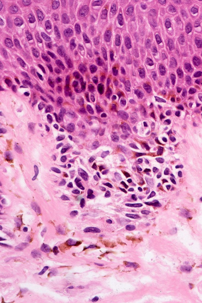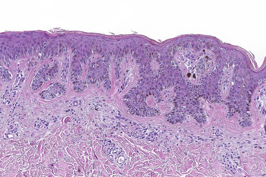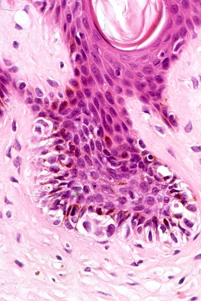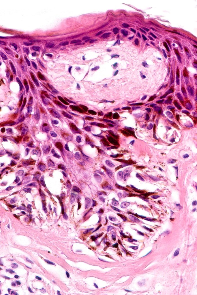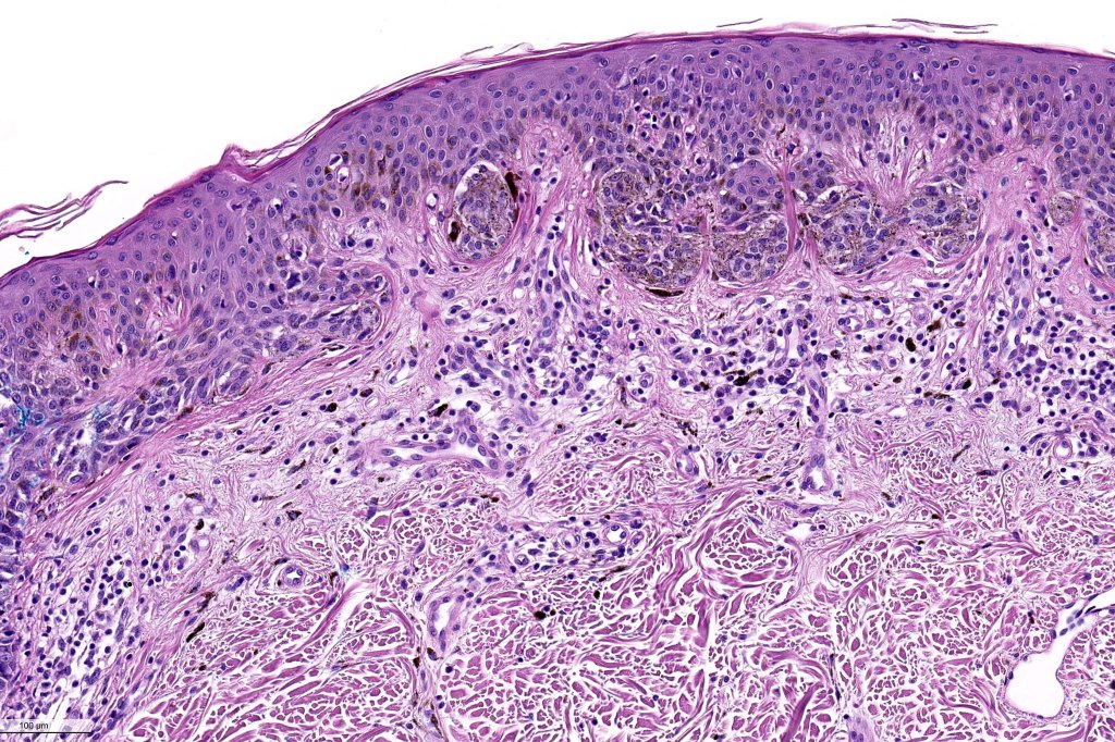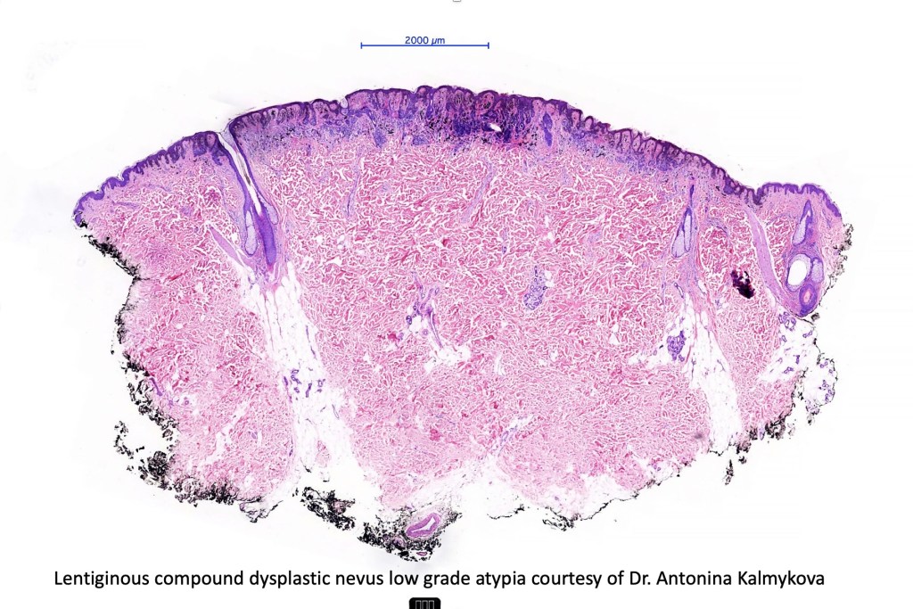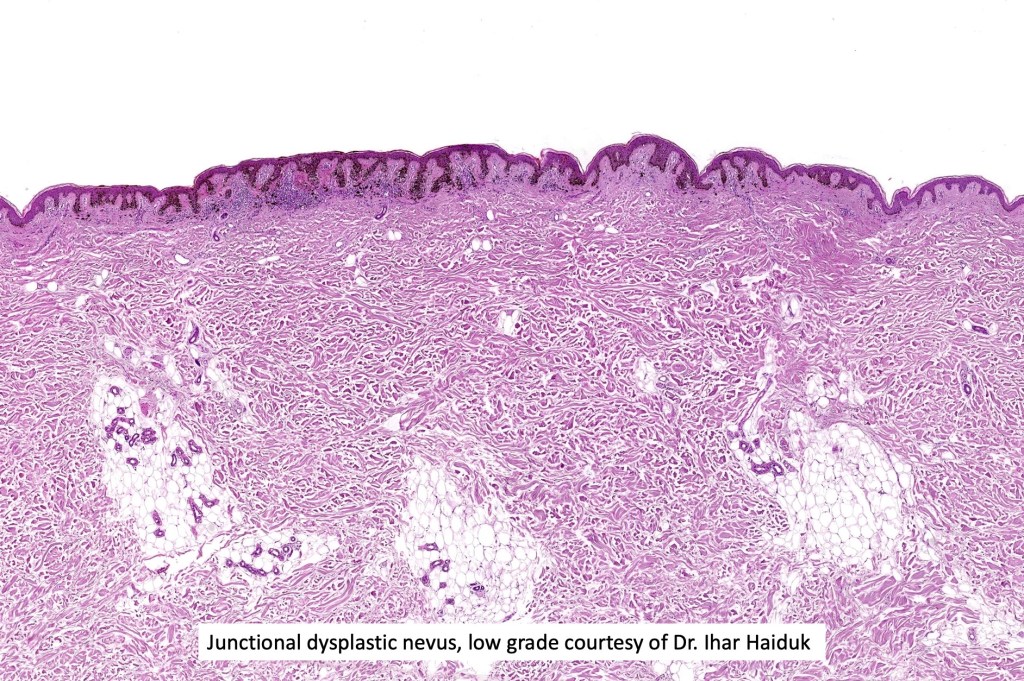 Dysplastic nevus in the majority of cases is instantly recognizable, often at low power. The most important differential diagnosis is obviously melanoma. In junctional lesions, widespread/uniform high grade atypia, frequent mitoses and Pagetoid spread are indicative of in situ melanoma. In compound lesions, dermal nests larger than junctional ones, expansile dermal nests, severe atypia and mitotic activity indicate the presence of melanoma