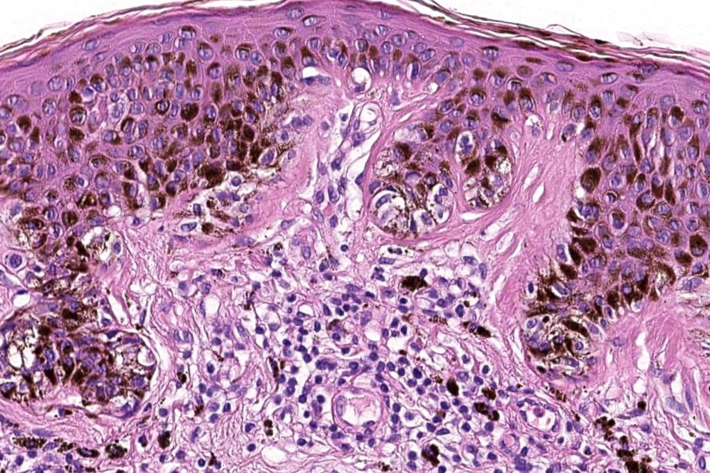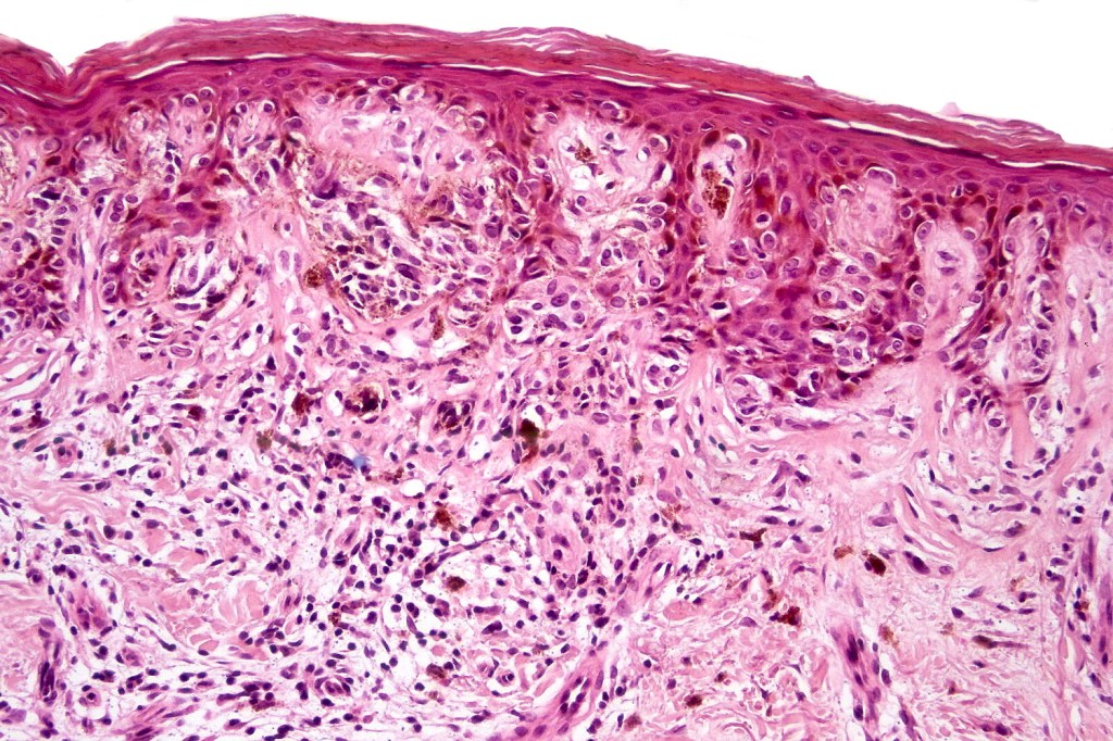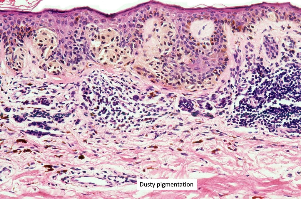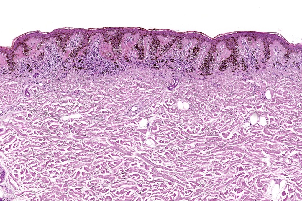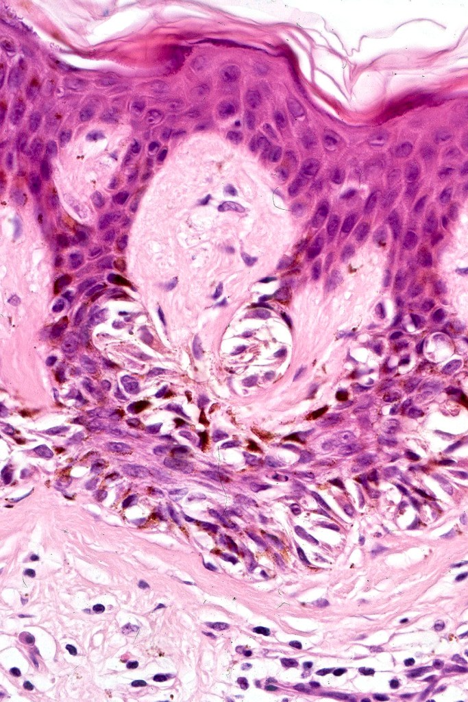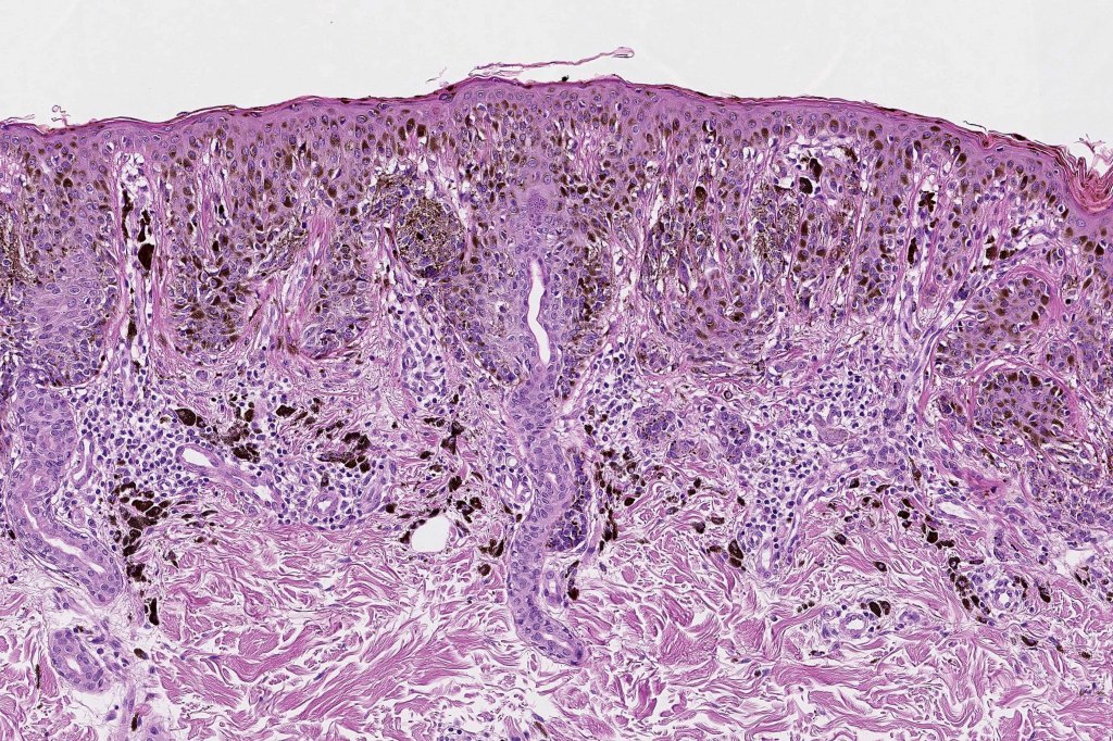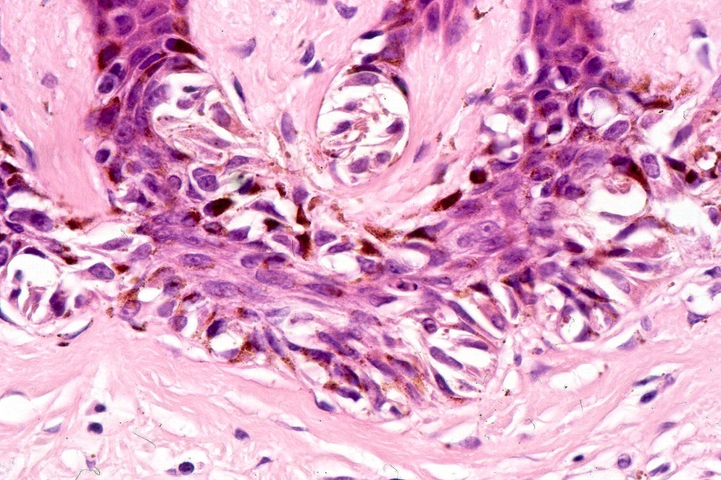 Dysplastic nevus in the majority of cases is instantly recognizable, often at low power. The most important differential diagnosis is obviously melanoma. In junctional lesions, widespread/uniform high grade atypia, frequent mitoses and Pagetoid spread are indicative of in situ melanoma. In compound lesions, dermal nests larger than junctional ones, expansile dermal nests, severe atypia and mitotic activity indicate the presence of melanoma