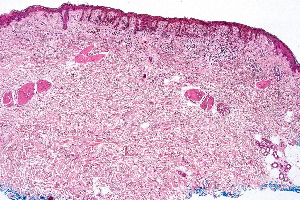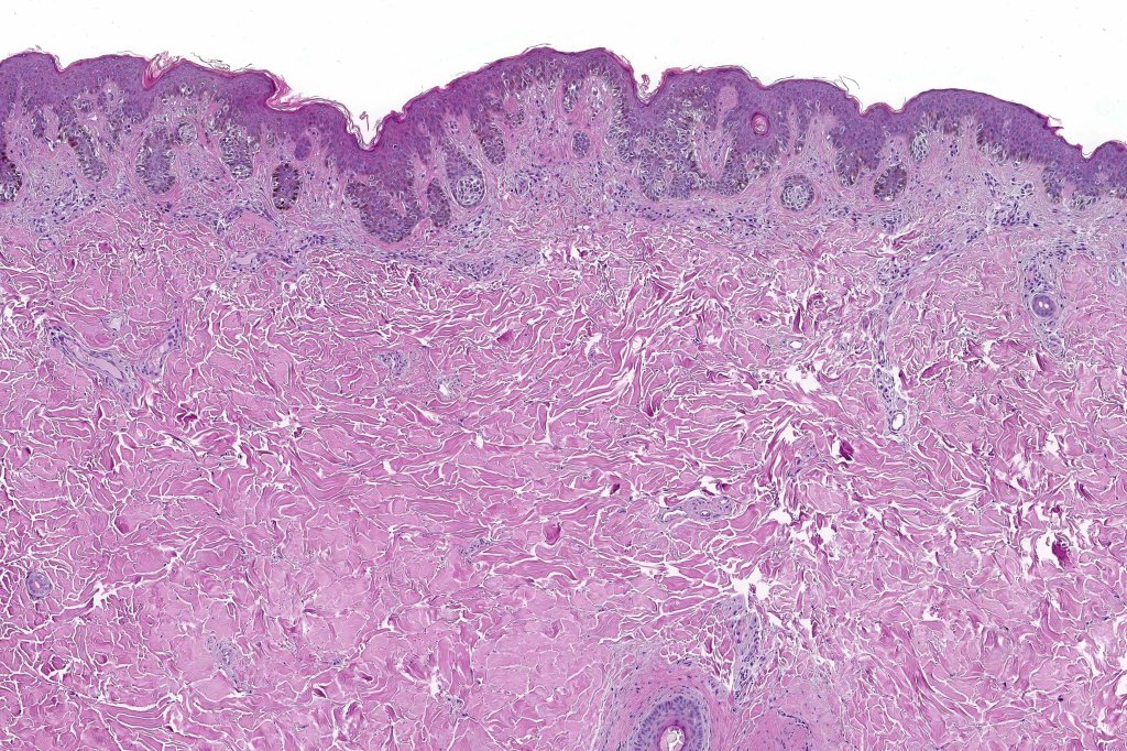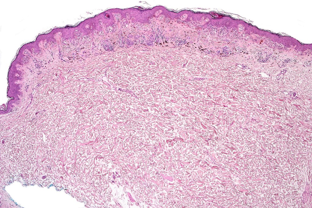 Dysplastic nevus is sometimes confused with early/evolving Reed nevi. The presence of an almost pure population of uniform, spindled melanocytes, often heavily pigmented nested lesion forming a flattened lower border make the distinction fairly straightforward. Reed nevus is symmetrical & circumscribed.