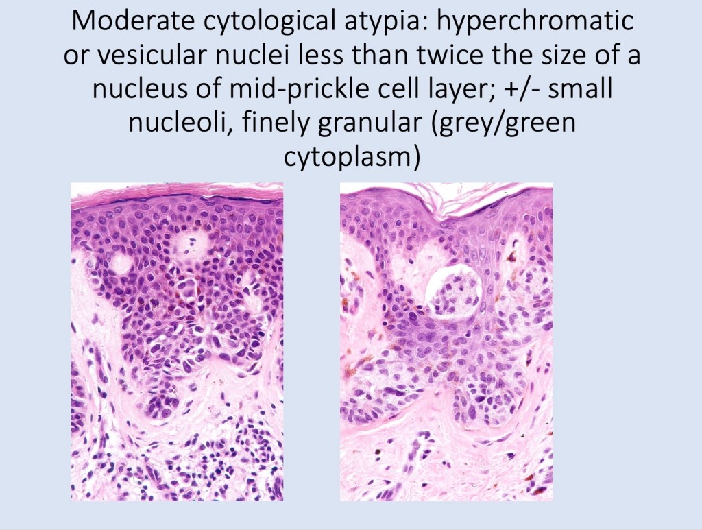 •Cytological atypia- mild, moderate & severe (or more recently, low & high grade (WHO). The problem with the new WHO classification is that mildly dysplastic nevi are now included with the banal nevus category and moderate is low grade and severe is high grade. In all likelyhood, most pathologists will include mild & moderate atypia in the low grade category.