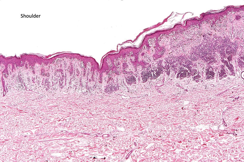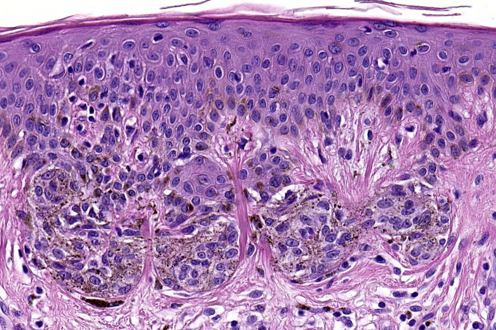 •Architectural disorder- lentiginous and nested, nests abnormally located (at the sides of the rete ridges & overlying the dermal papillae in addition to the tips of the rete ridges rather than solely occupying the tips of the rete ridges as is seen in banal nevi), horizontal orientation & bridging between junctional nests (this should not be confused with bridging between adjacent rete ridge squamous epithelium)