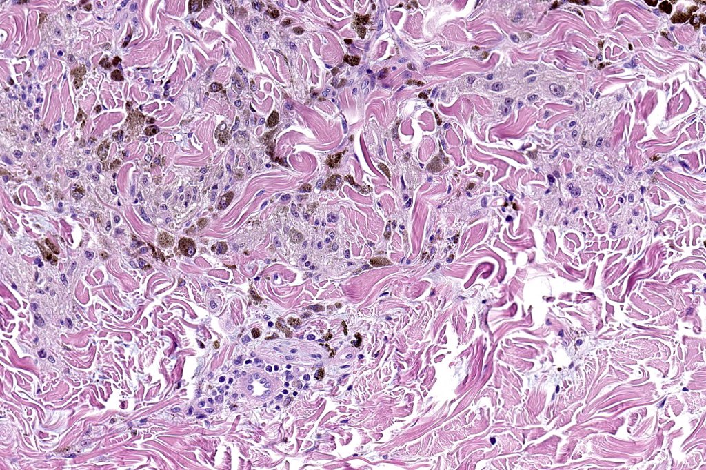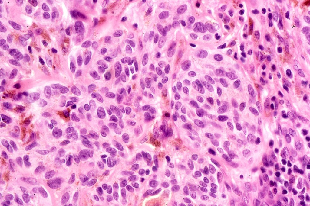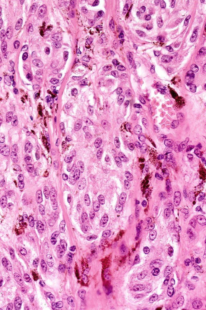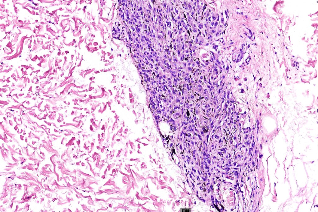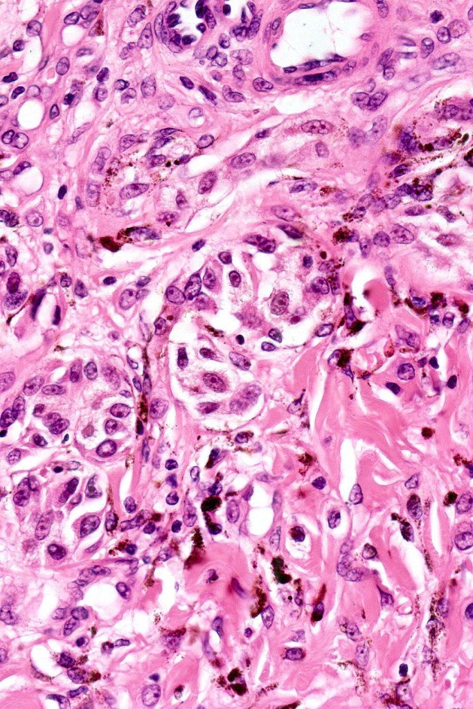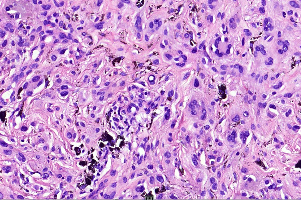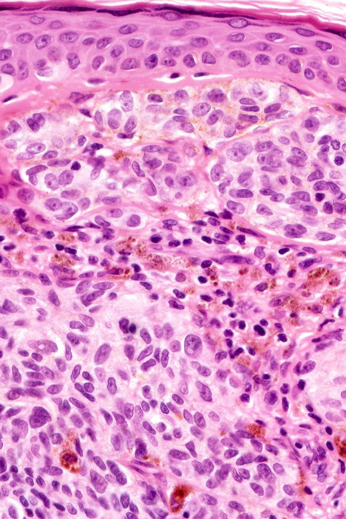 •Irregular up to 1.0 cm diameter dark brown or black papule or nodule