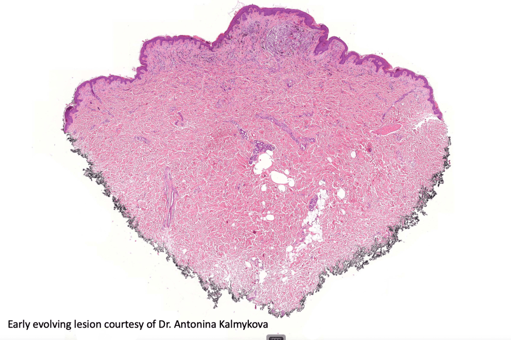 •Symmetrical, circumscribed wedge-shaped infiltrate-most common growth pattern with the broad base uppermost, deeper aspect extends along appendageal structures & neurovascular bundles with a fasciular or plexiform pattern