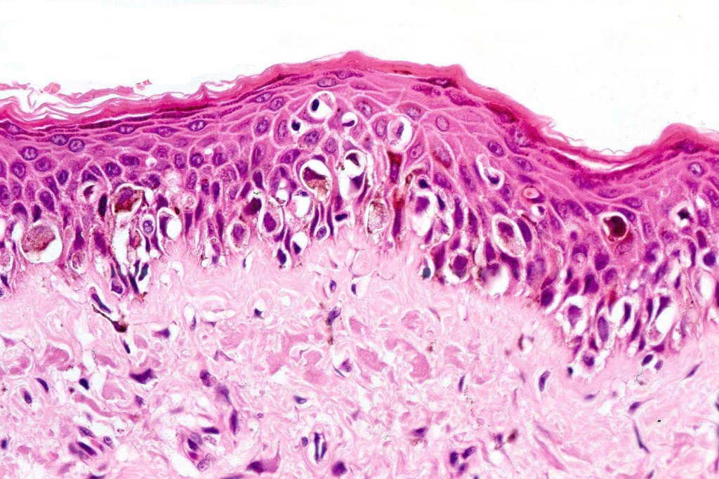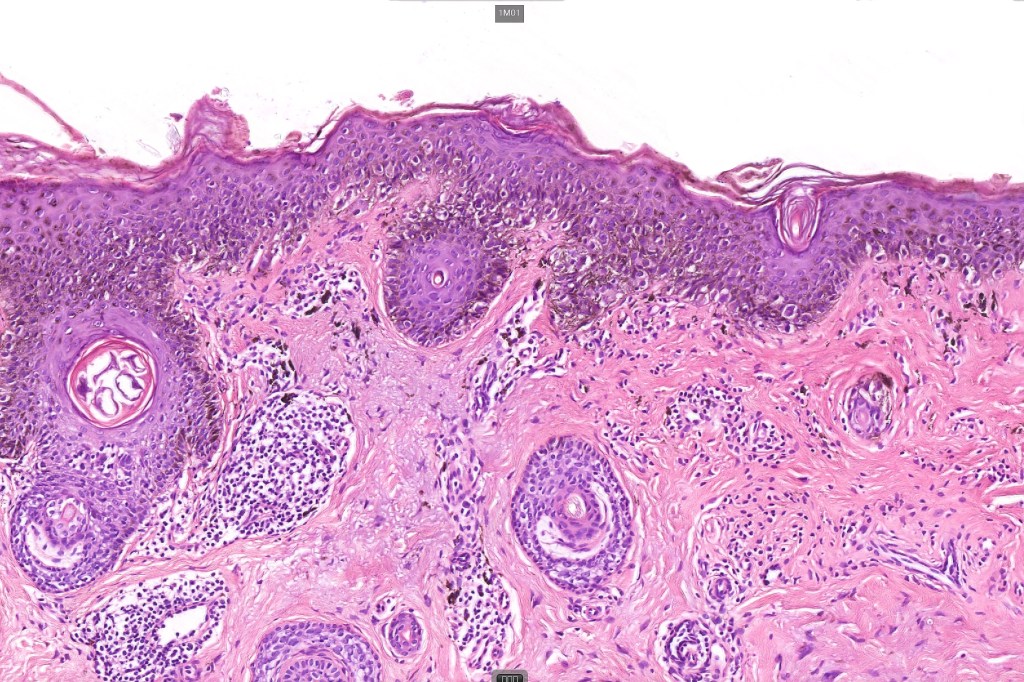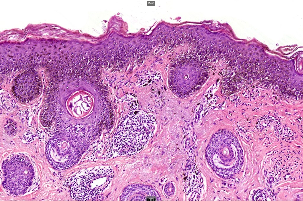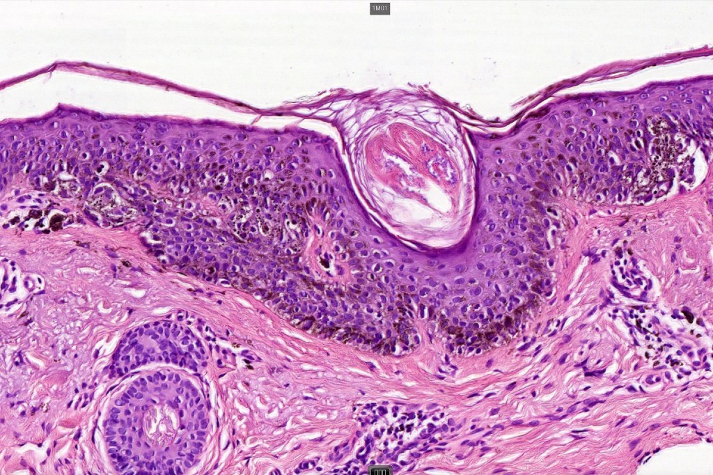 •Atypical melanocytes located predominantly along the basal layer of the epidermis, singly, in short arrays or extensively involving the whole epidermis