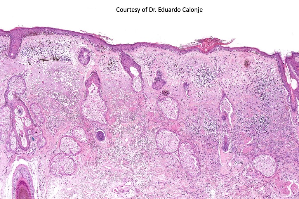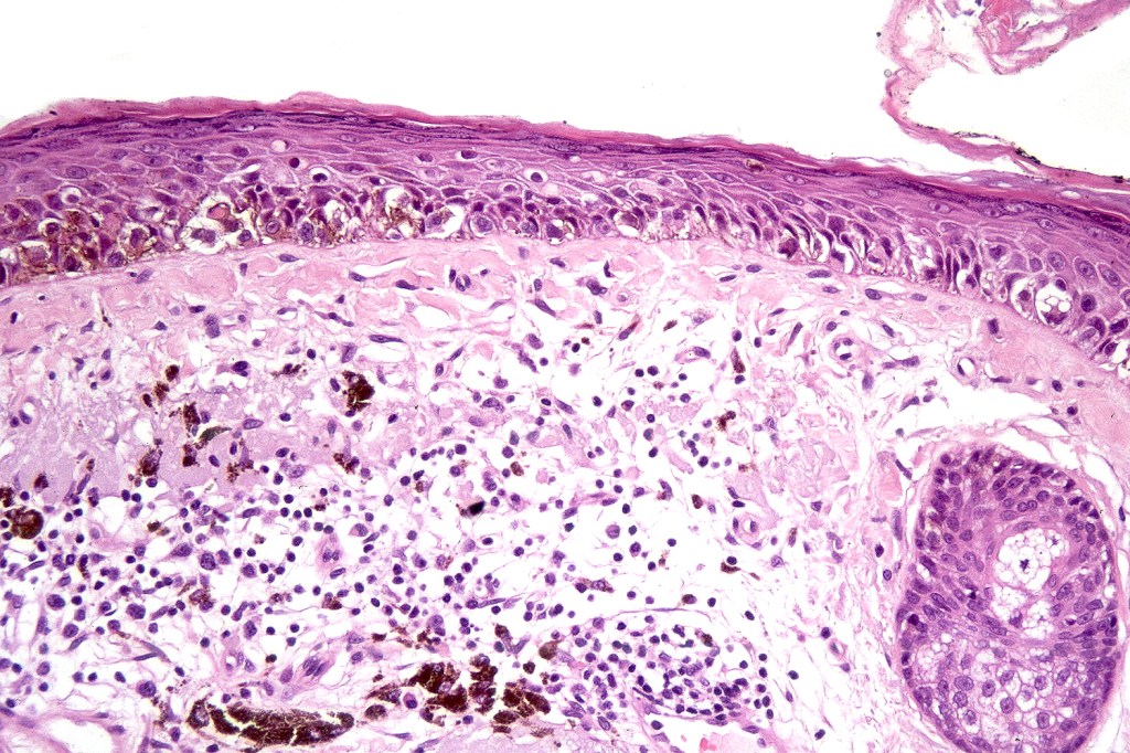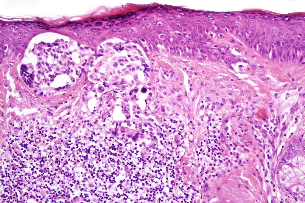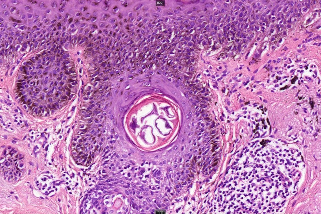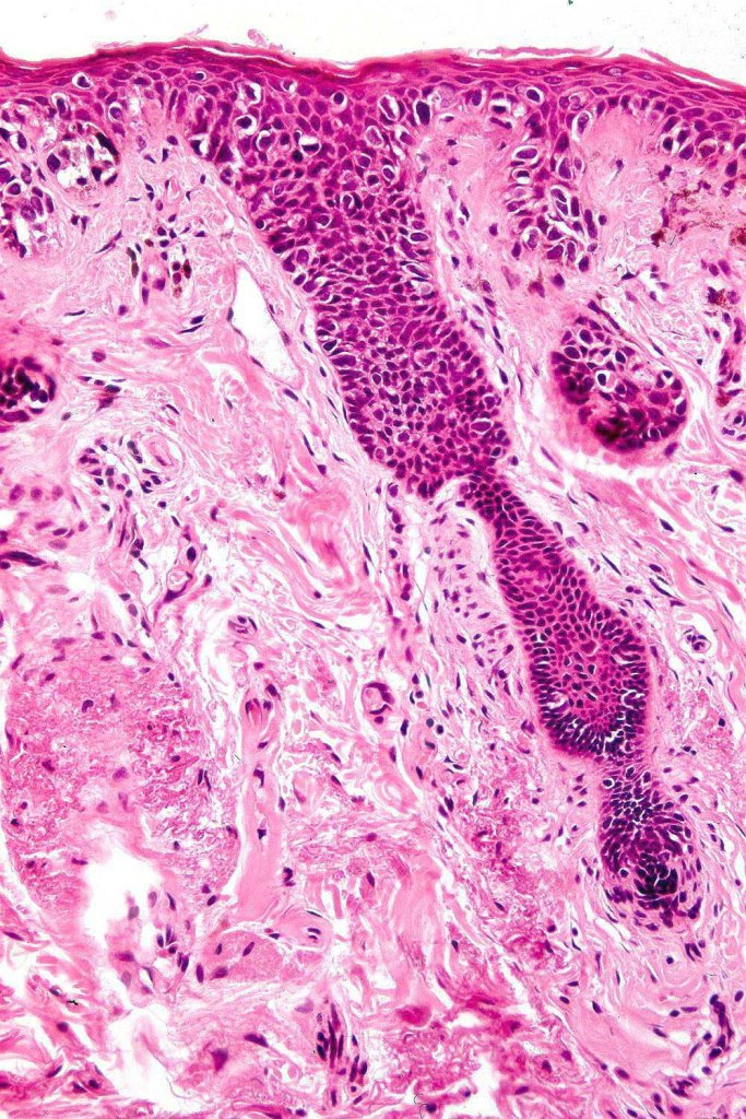 •Atypical melanocytes located predominantly along the basal layer of the epidermis, singly, in short arrays or extensively involving the whole epidermis