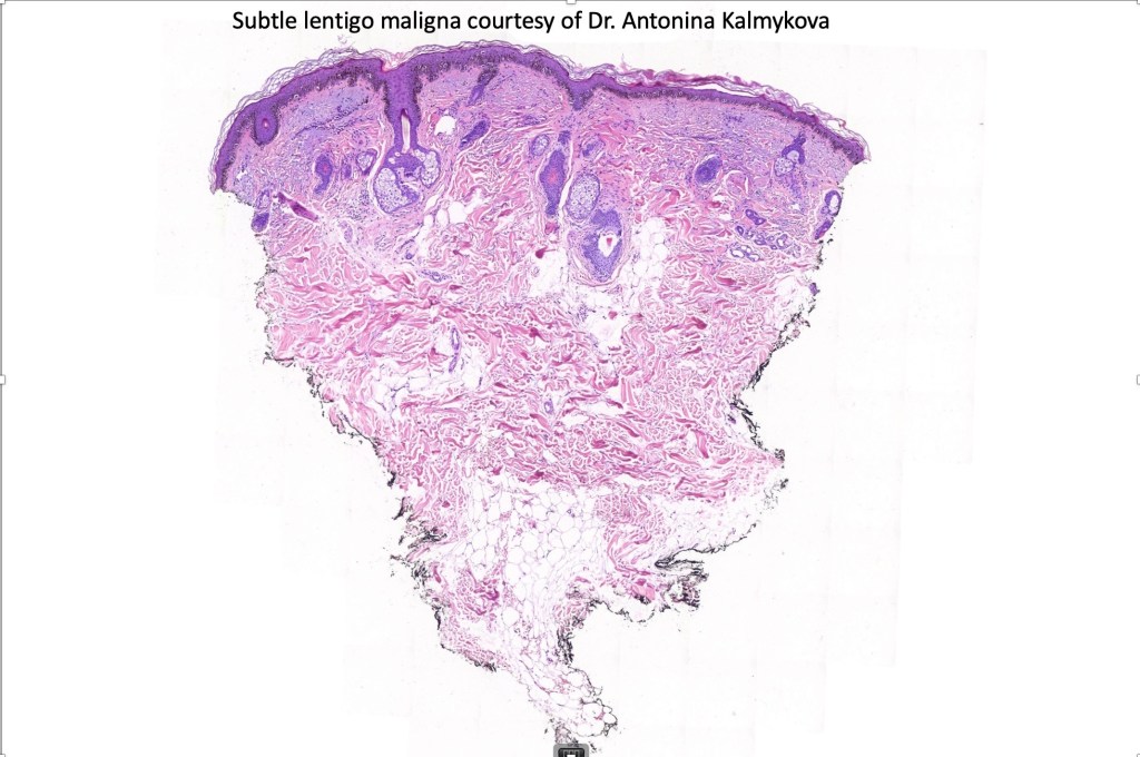 Melanocytic (atypical) hyperplasia of sun damaged skin is the most important differential diagnosis. This can be extremely challenging, particularly when examining the margins for completeness of excision. The problem is even worse with MOH’s surgery specimens. Points of distinction include predominace of single cells, abscence of linear arrays of atypical melanocytes, absence of mitoses, nests and Pagetoid spread.