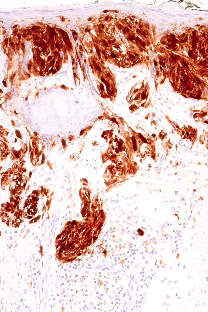 •Dense melanin pigmentation may affect the whole epidermis making it difficult to determine which cells are melanocytes & which are keratinocytes! DAB-lablled antibodies should be avoided as they can be impossible to interpret