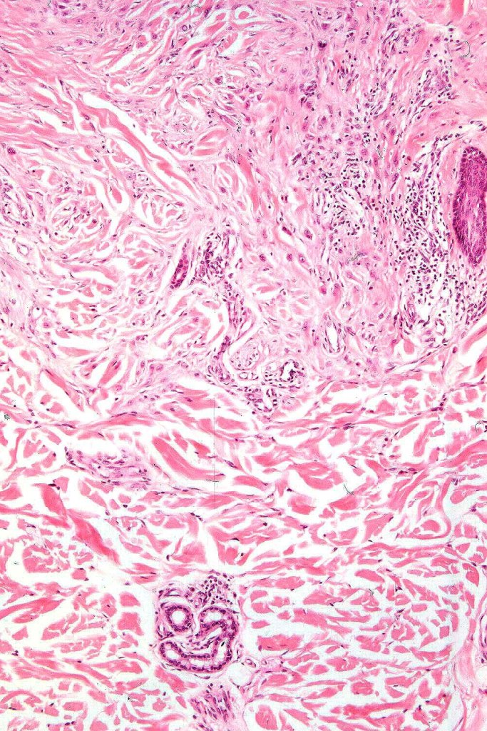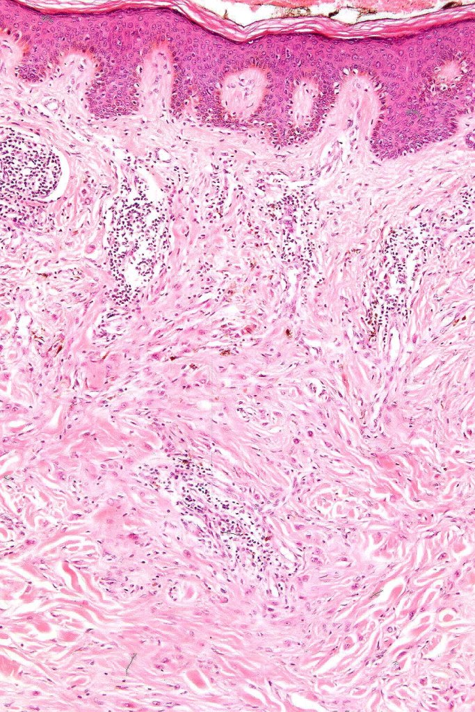 Although desmoplasia may exceptionally be encountered in banal/common and congenital nevi, the overwhelming majority of cases represent sclerosis in Spitz nevi. Desmoplastic blue neves is discussed in a separate blog. Desmoplastic nevus arising on chronic sun-damaged skin has also been described.