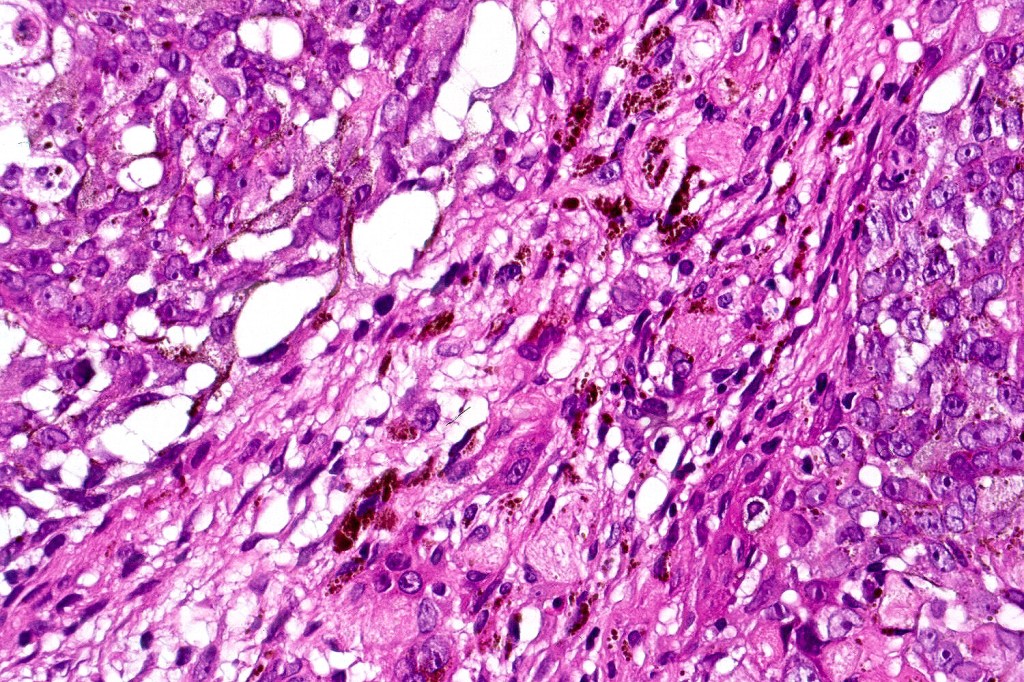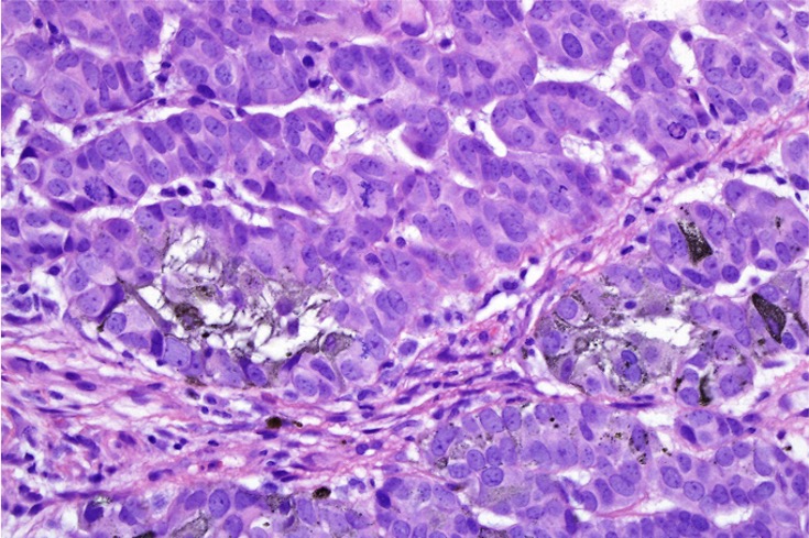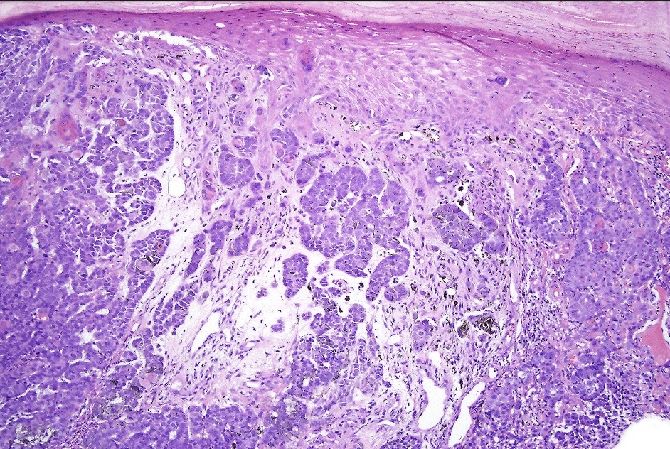 Melanocytic matricoma should be differentiated from pigmented pilomtricoma. This is much nore common and is characterized by pigmented dendritic cells and pigmented matrical cells in the abscence of any mitotic activity or pleomorphism in the melanocytic population. However, there can be considerable overlap.