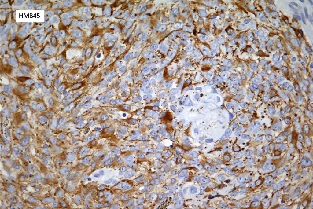 •Heavily pigmented dendritic +/- epithelioid melanocytes