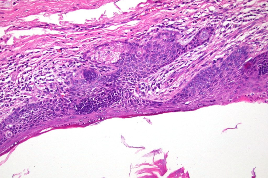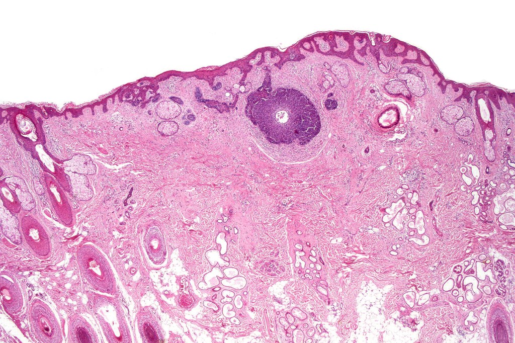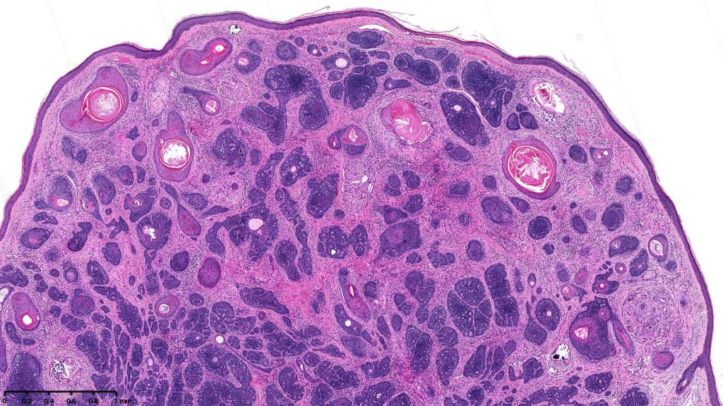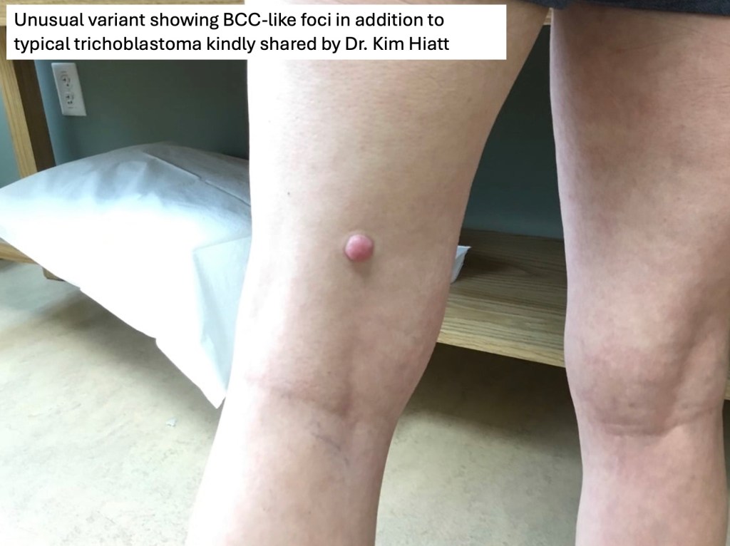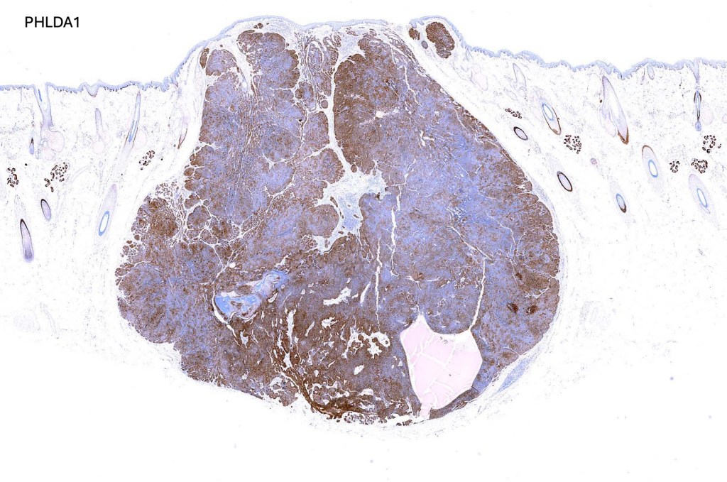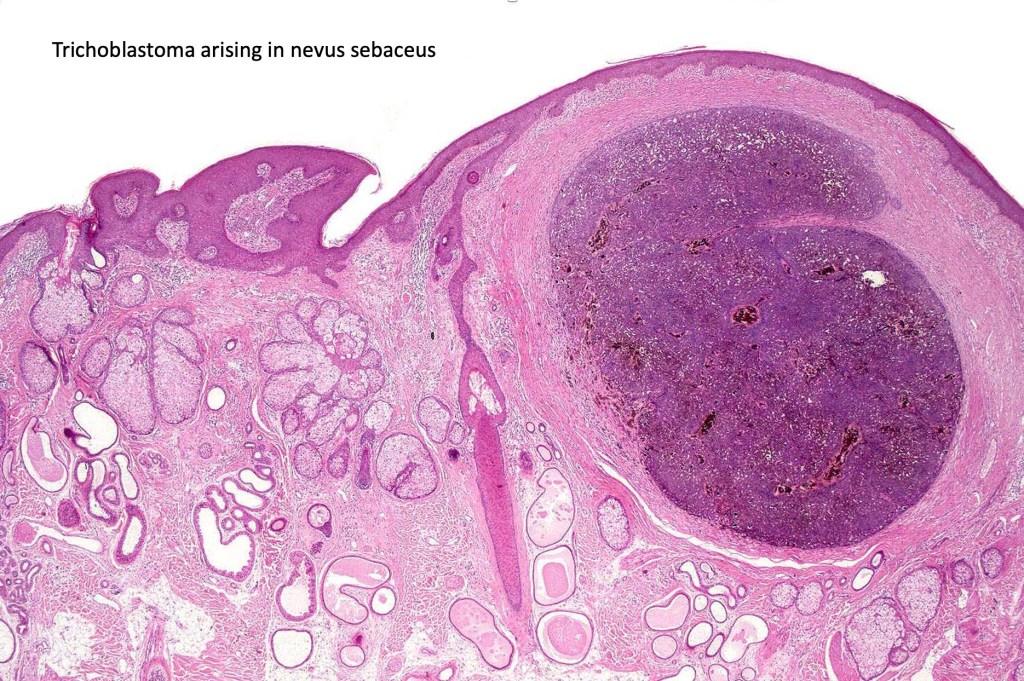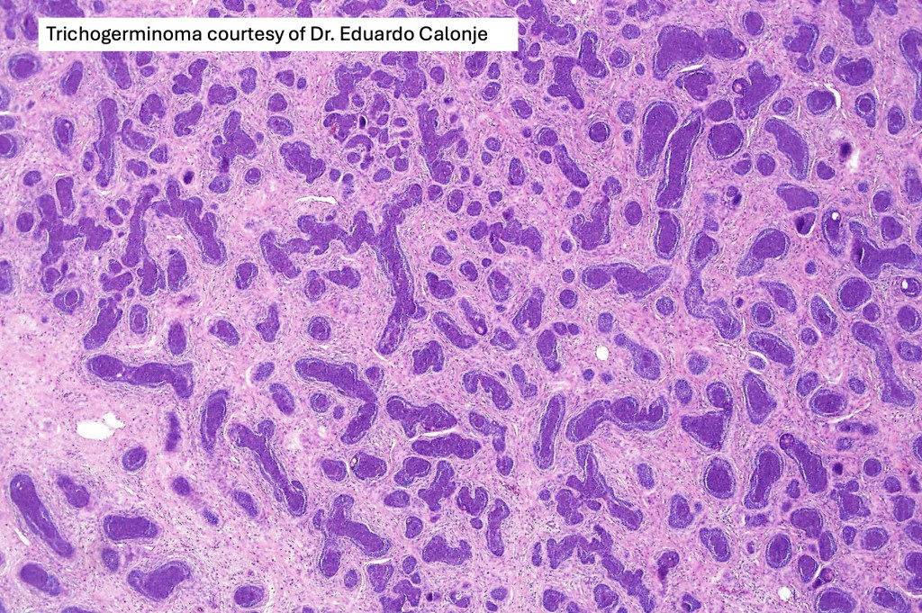 •Although many authors state that an epidermal origin/connection is not a feature of trichoblastoma, my own experience is that this can often be present particularly in those examples where a superficial dermal component is present in addition to the deep dermal/subcutaneous element