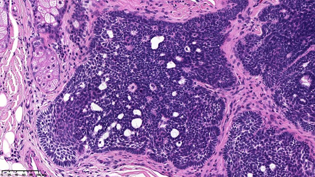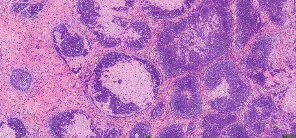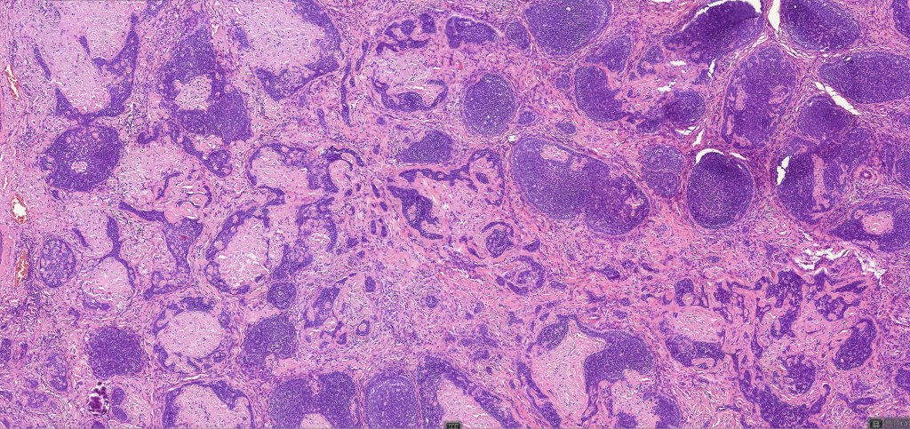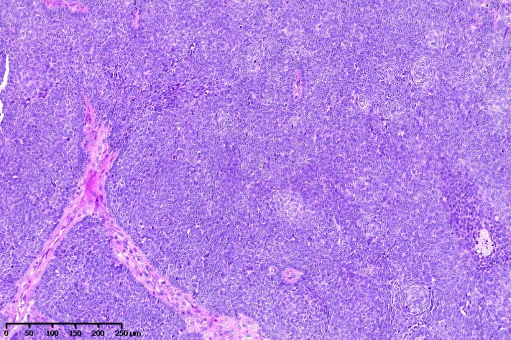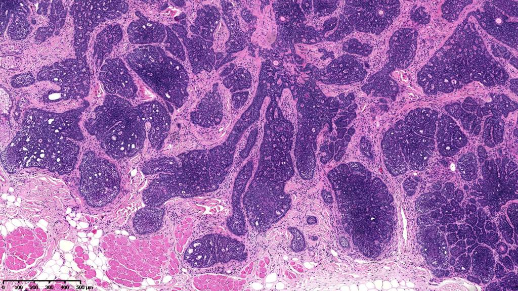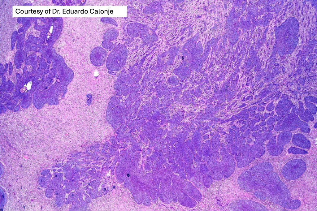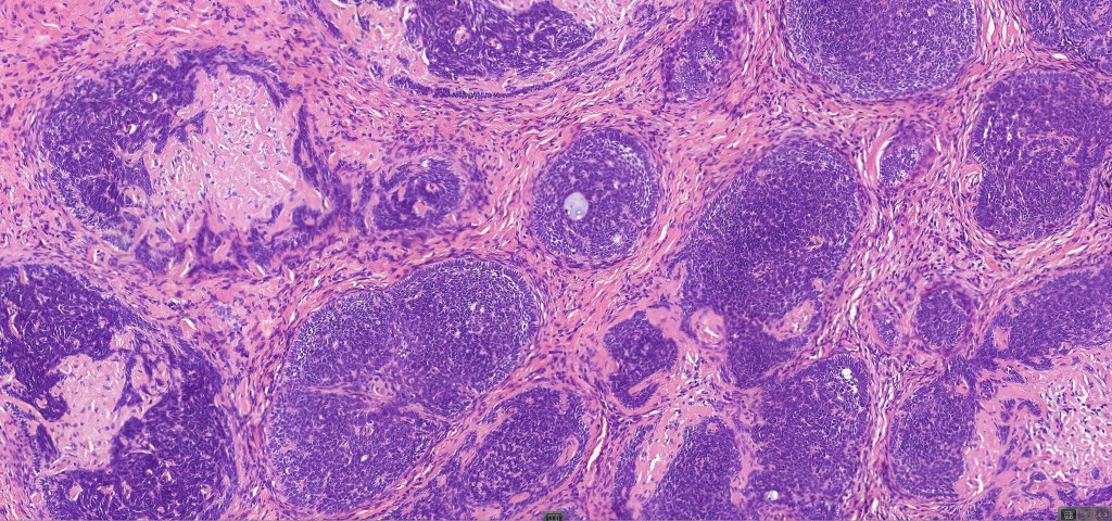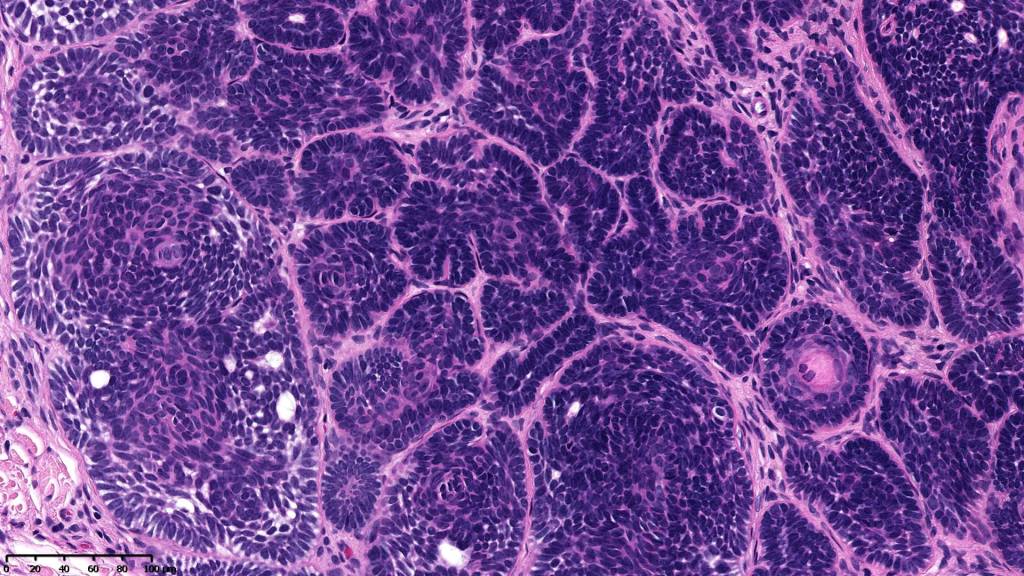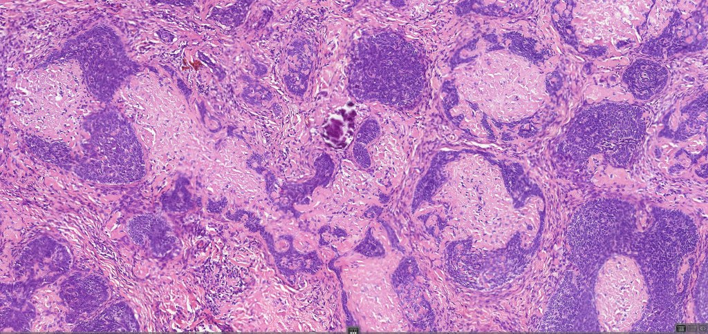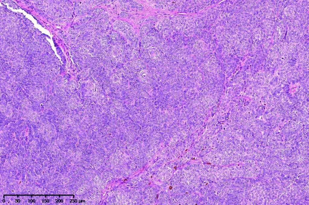 •Variably sized but generally large, basophilic tumor nodules composed of small uniform basaloid cells with minimal cytoplasm