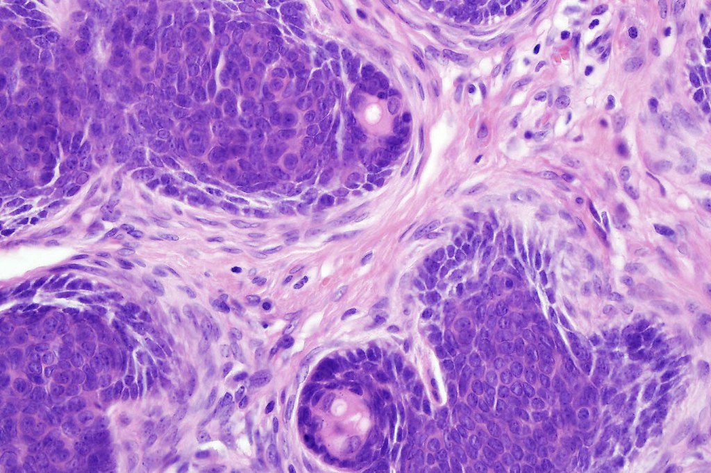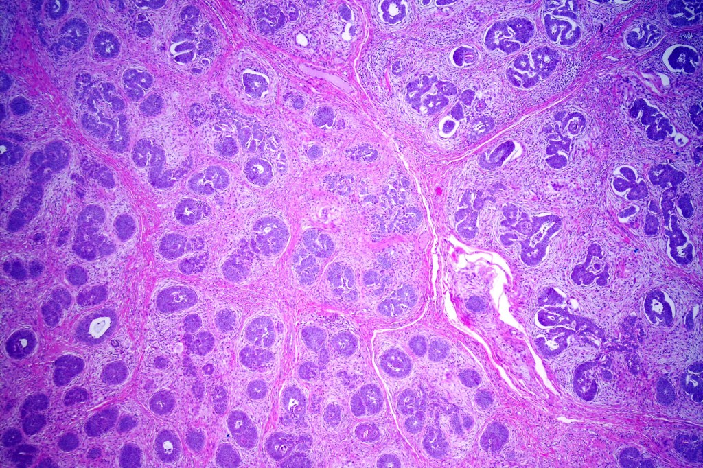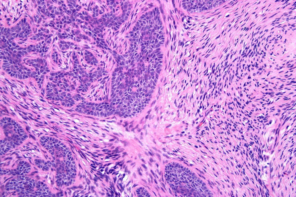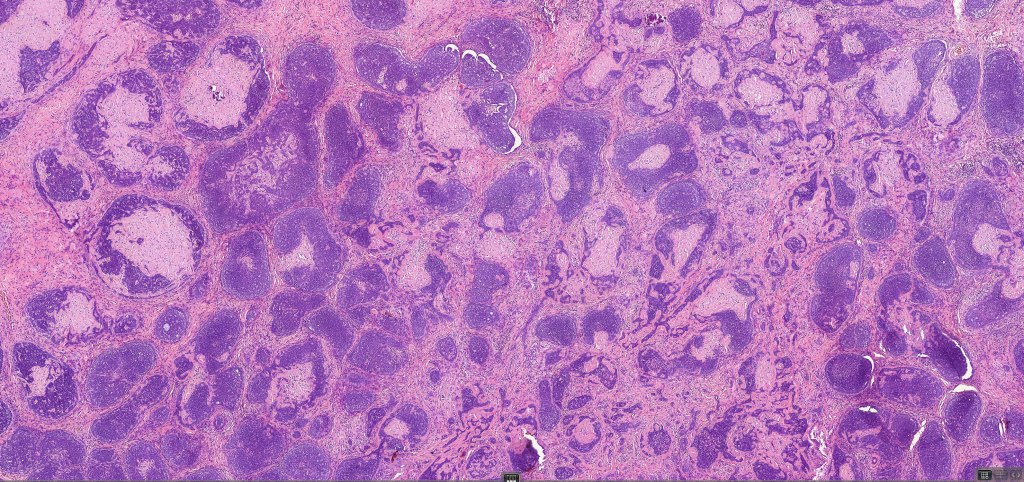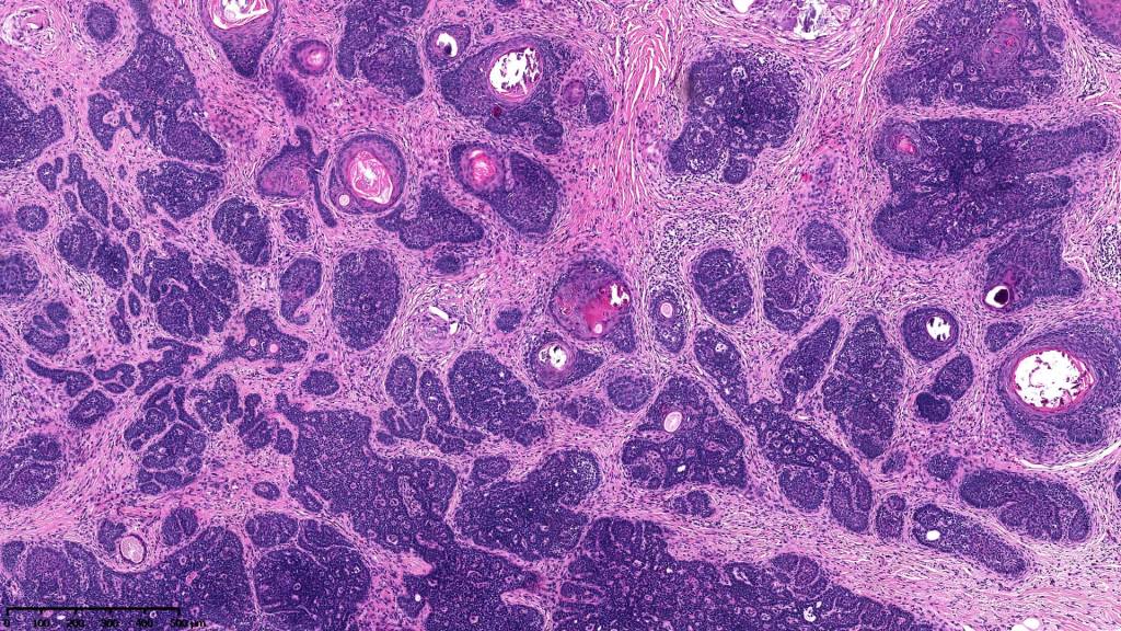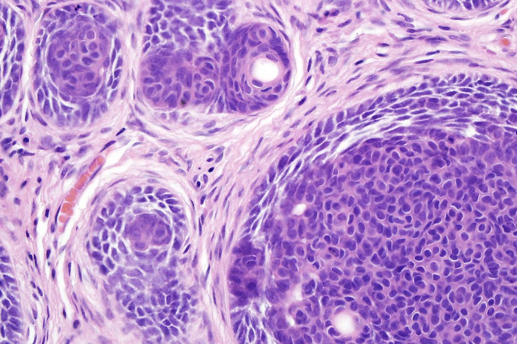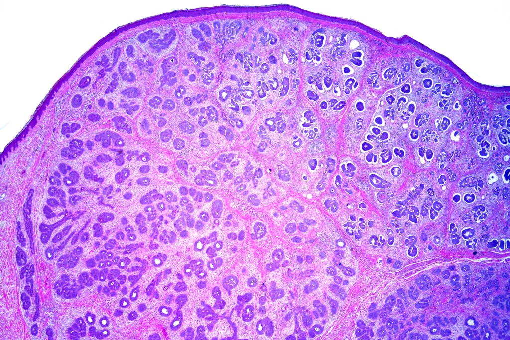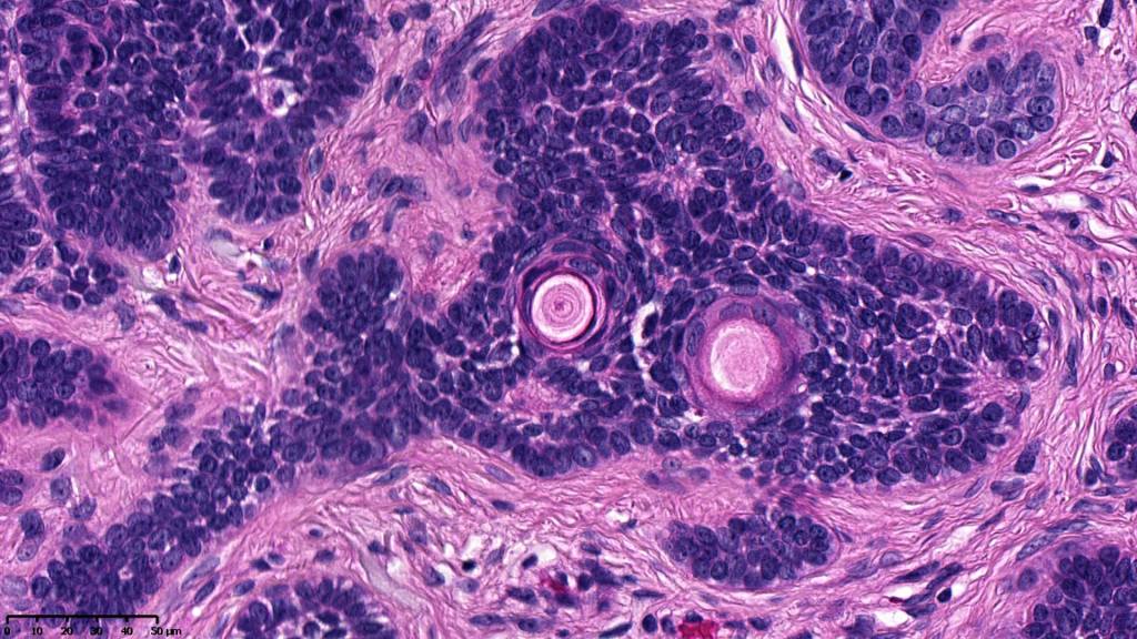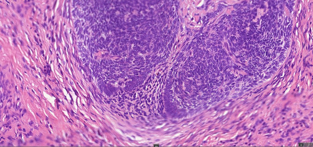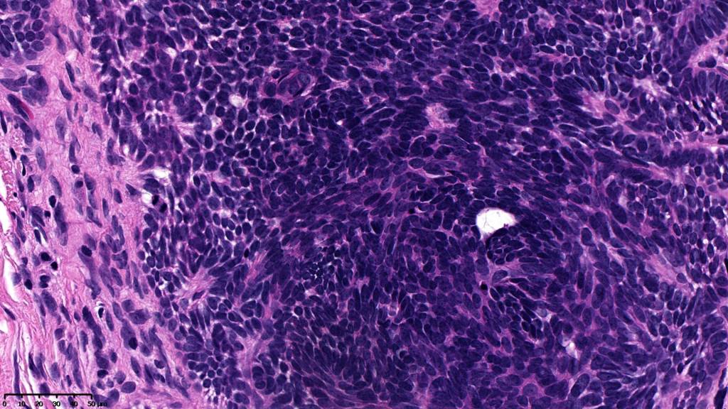•Variably sized but generally large, basophilic tumor nodules composed of small uniform basaloid cells with minimal cytoplasm