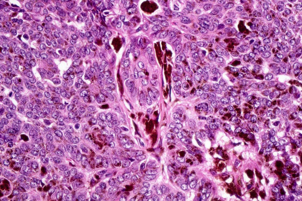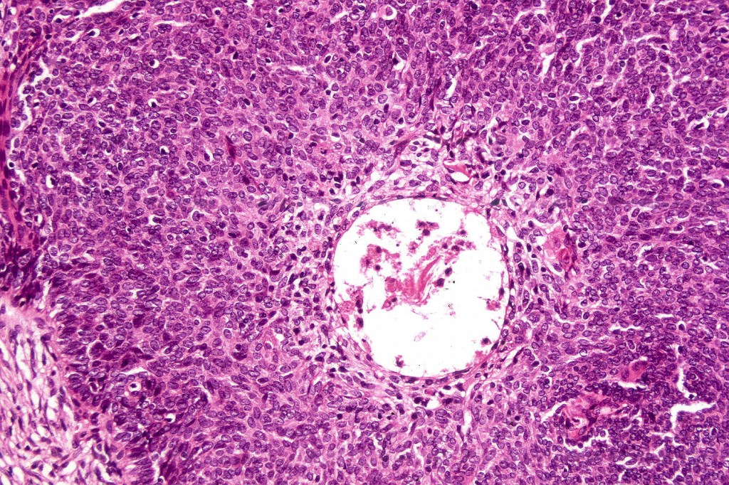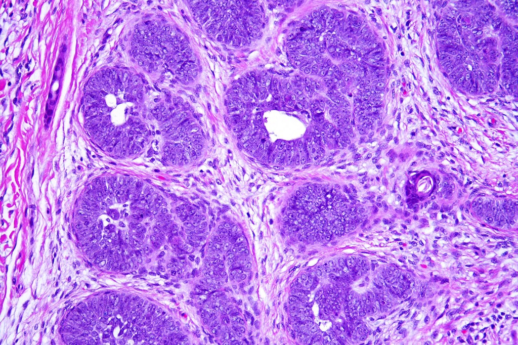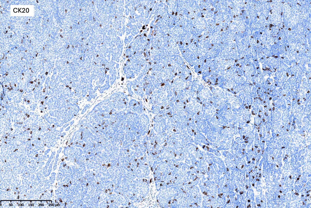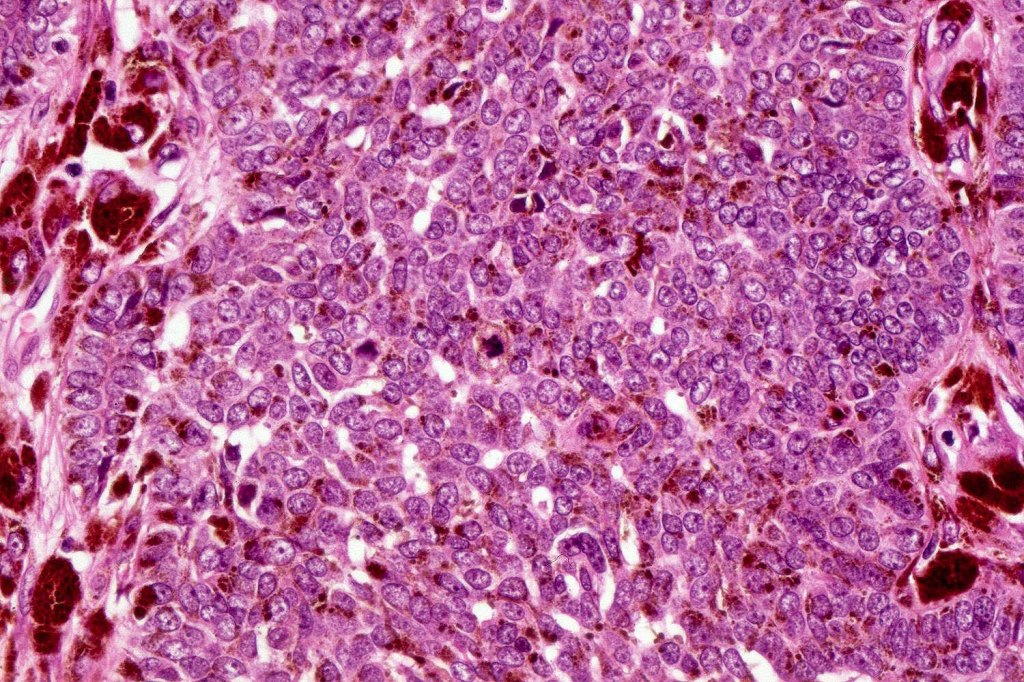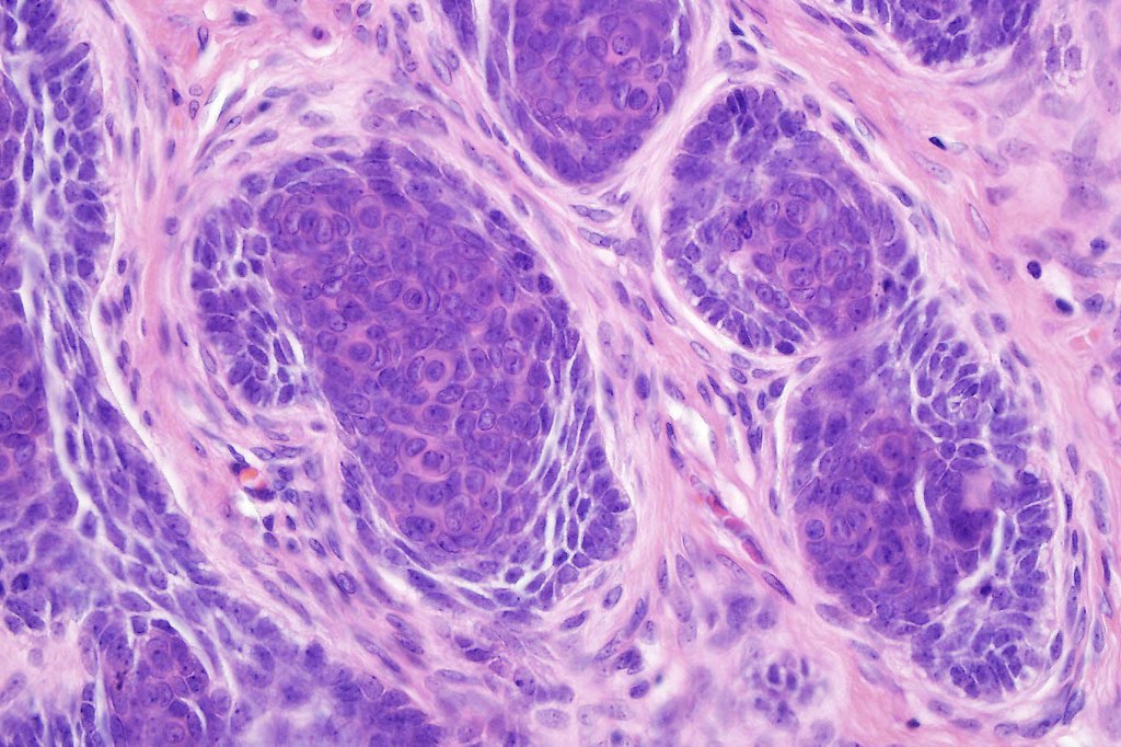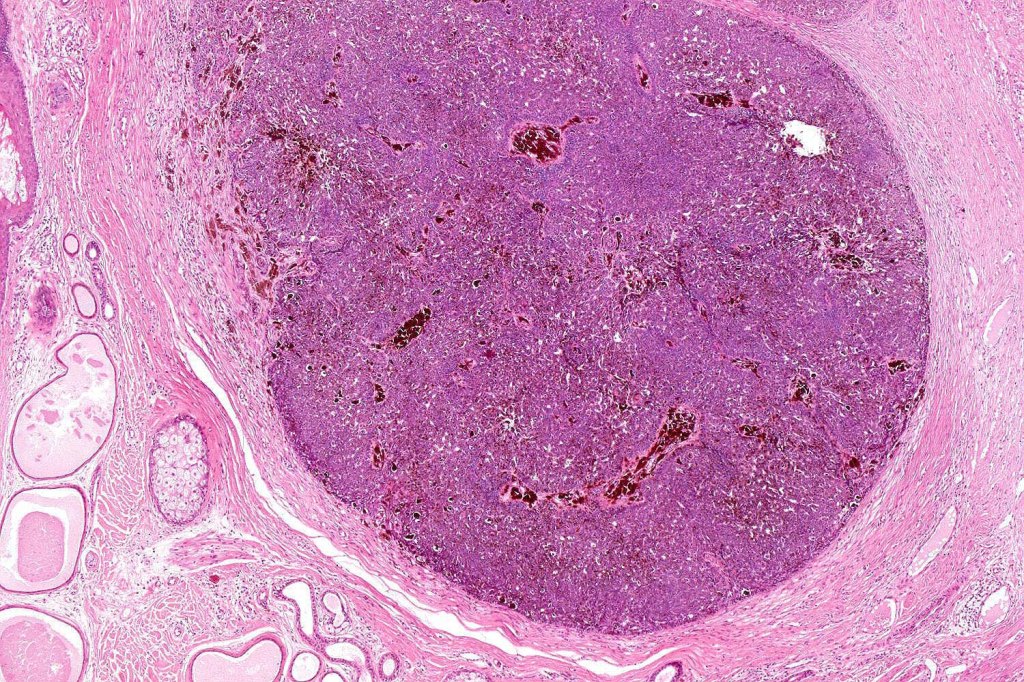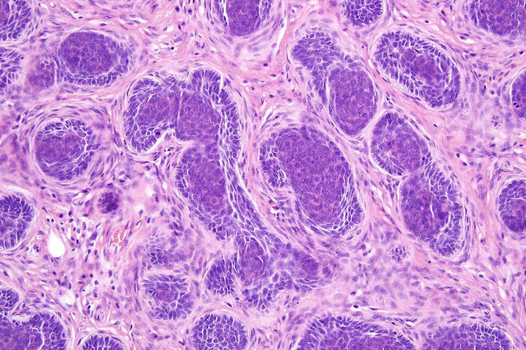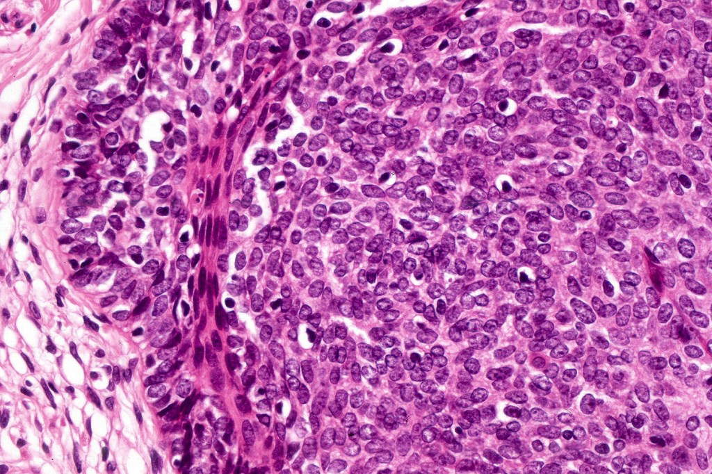 •Variably sized but generally large, basophilic tumor nodules composed of small uniform basaloid cells with minimal cytoplasm