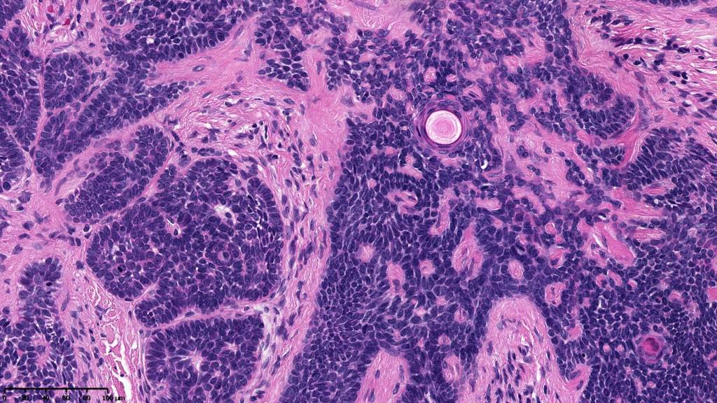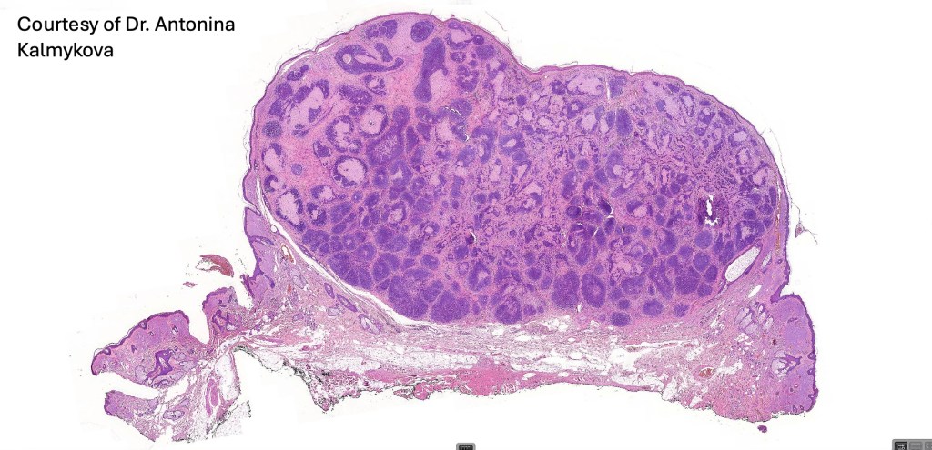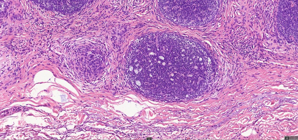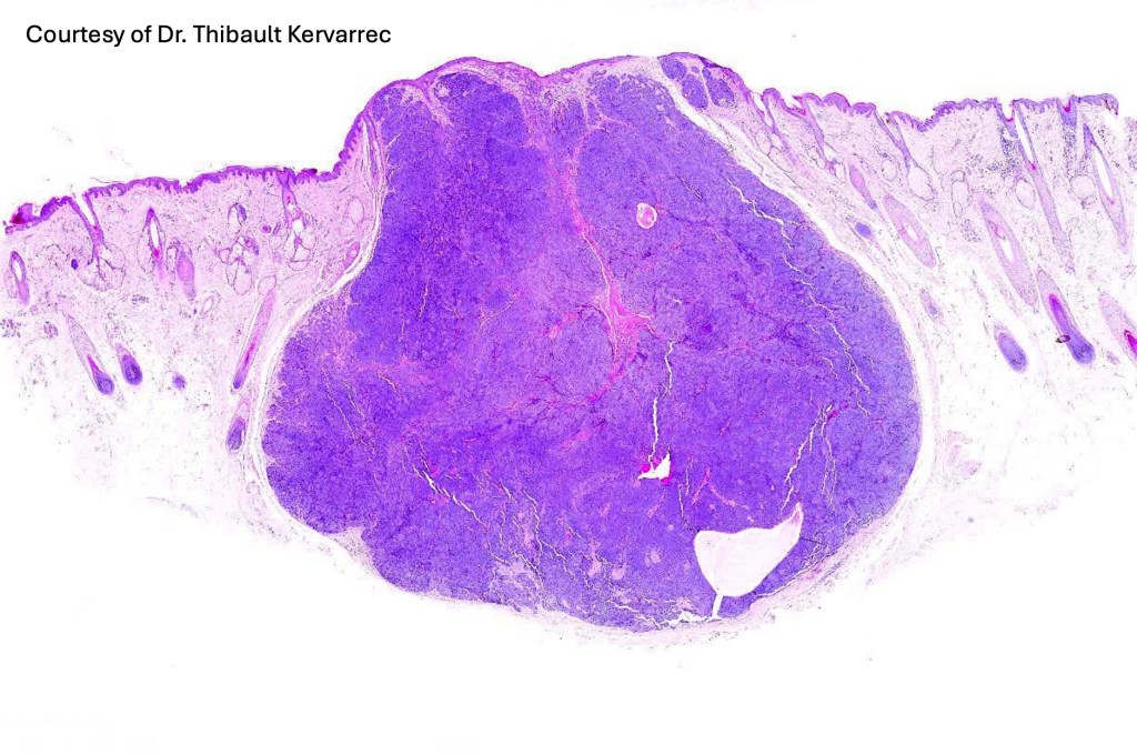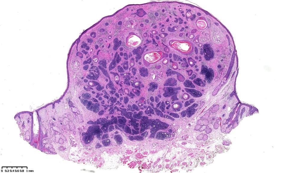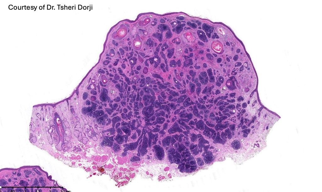 •Sharply circumscribed, unencapsulated nodule in deep dermis +/- subcutaneous fat or deeper (trichoepithelioma is much more superficial)