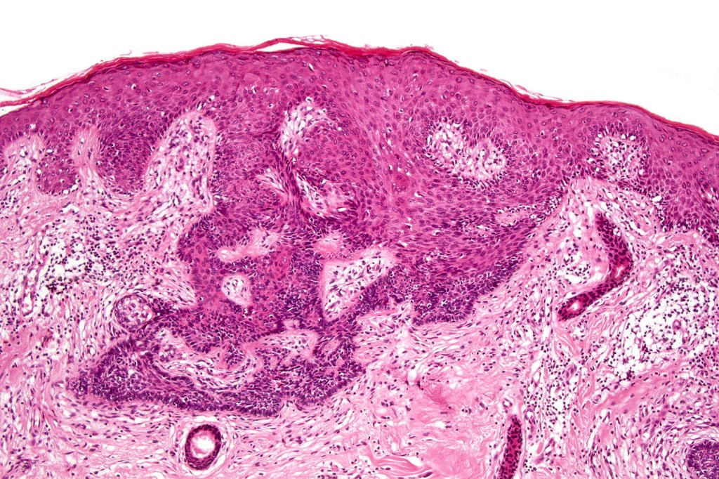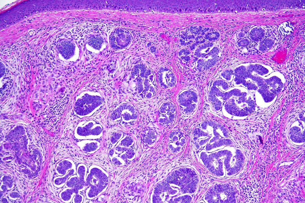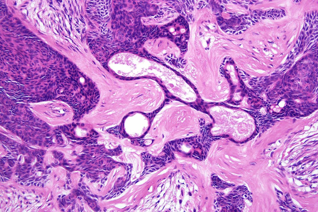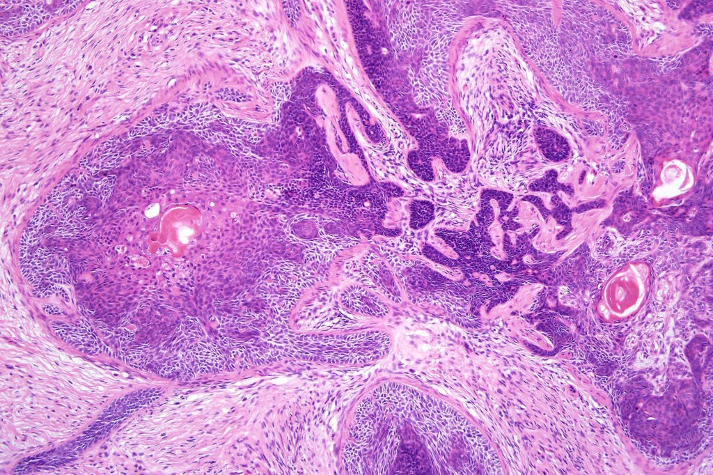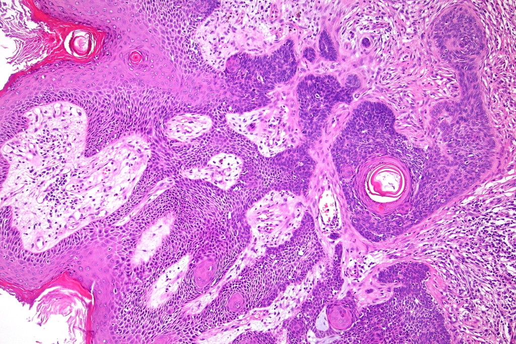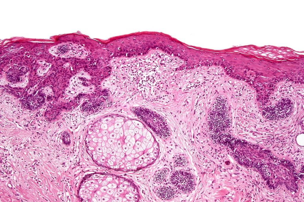 •Sharply circumscribed, unencapsulated nodule in deep dermis +/- subcutaneous fat or deeper (trichoepithelioma is much more superficial)