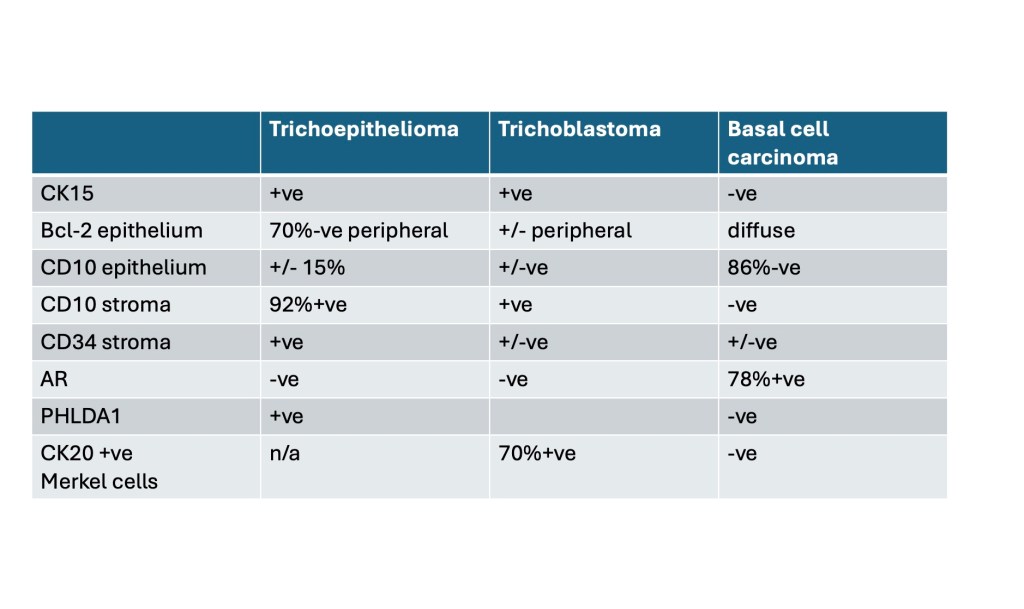 Trichoblastoma can be distinguished from BCC by the absence of retraction artifact and stromal mucin deposition. BCC does not show papillary mesenchymal bodies. Immunohistochemical differences are shown in the table below.