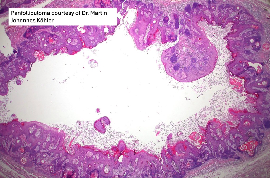 •Panfolliculoma represents an often-cystic trichoblastoma showing differentiation toward all follicular elements