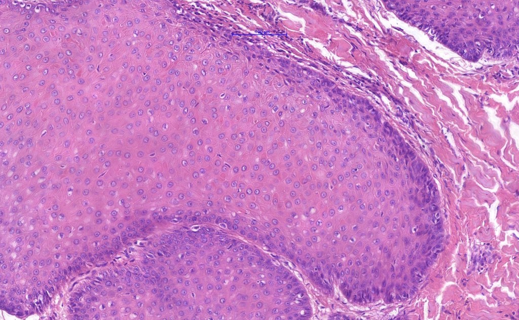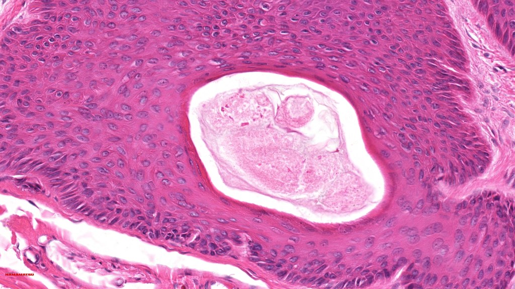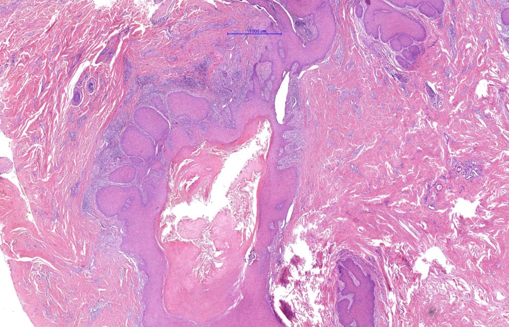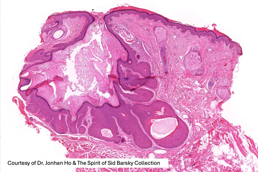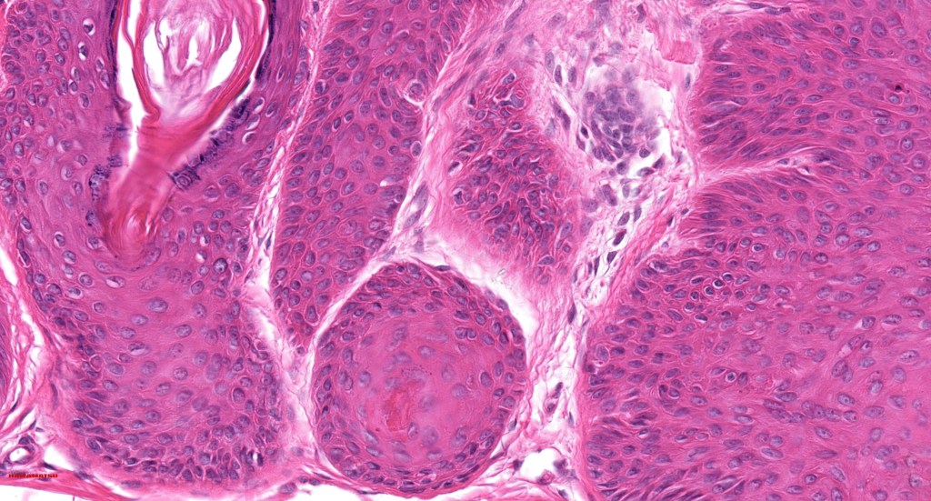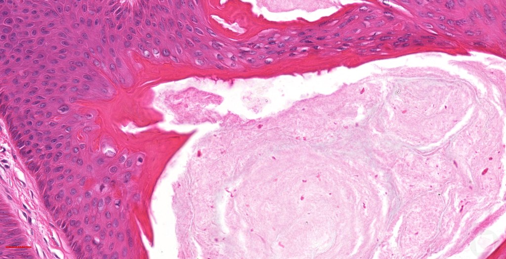 •Multilobulated cyst with associated lobules of well differentiated squamous epithelium