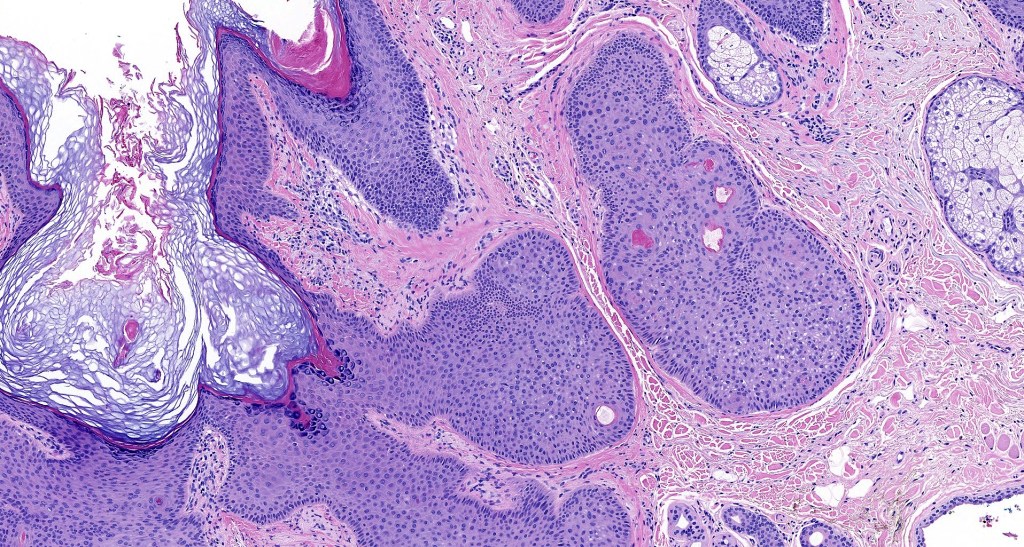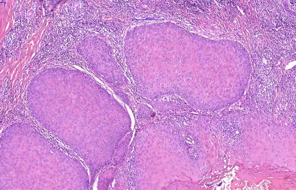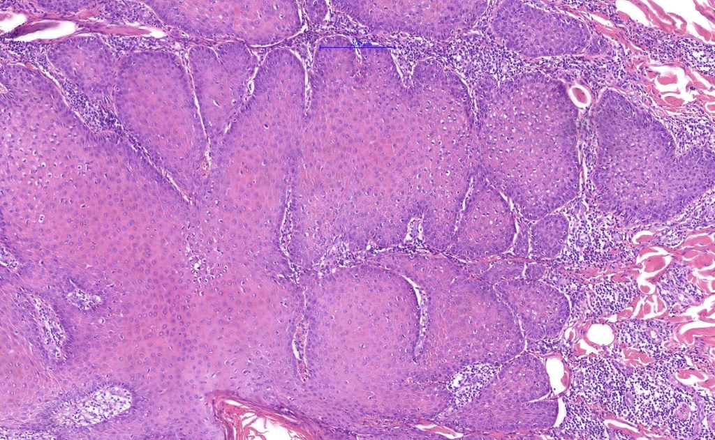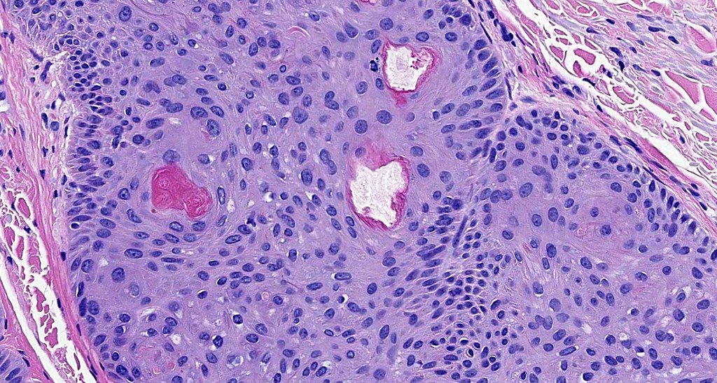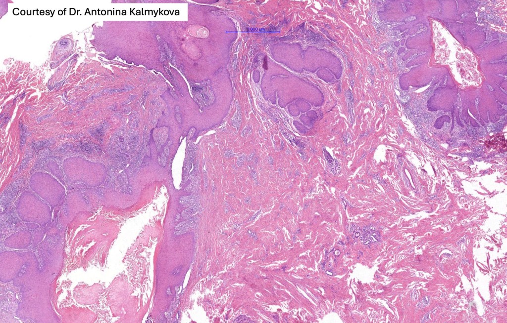 •Multilobulated cyst with associated lobules of well differentiated squamous epithelium