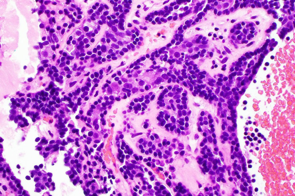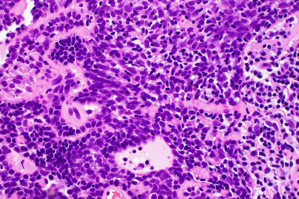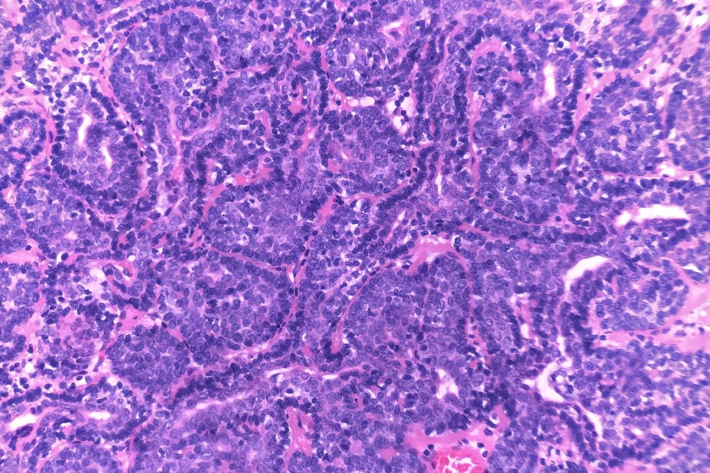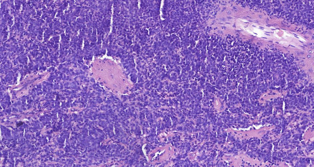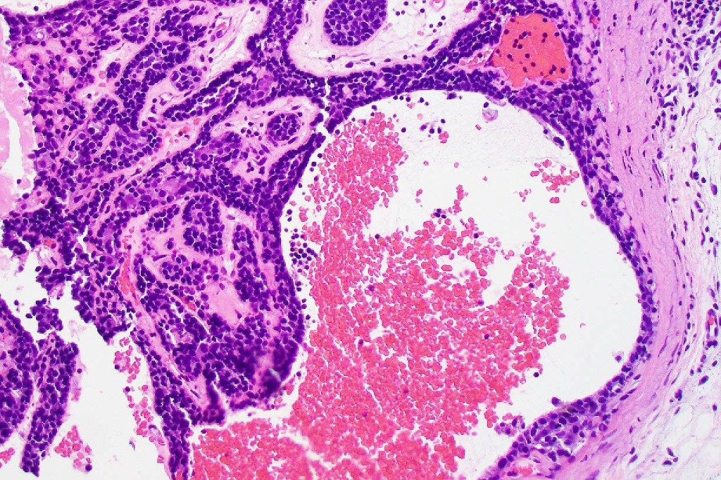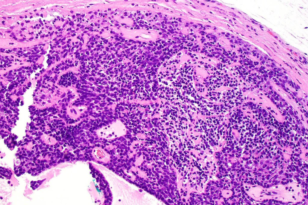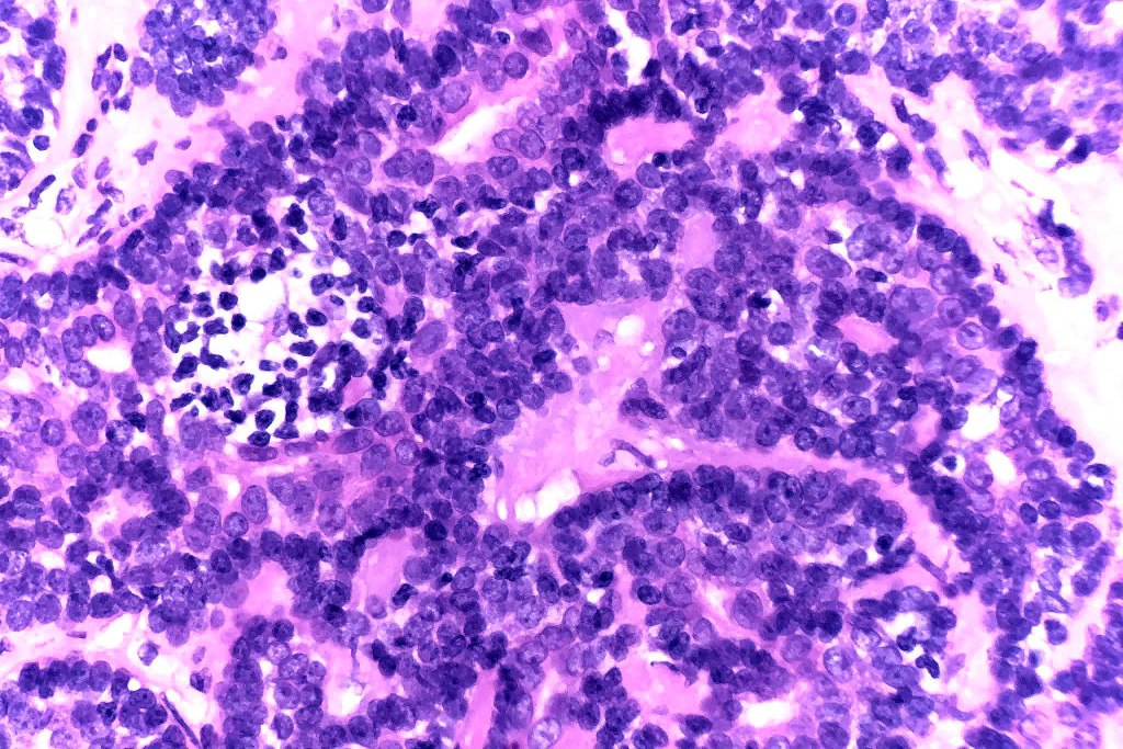 •Outer layer of small intensely basophilic cells surrounding larger pale staining or eosinophilic cells with vesicular nuclei & small nucleoli