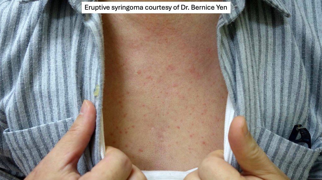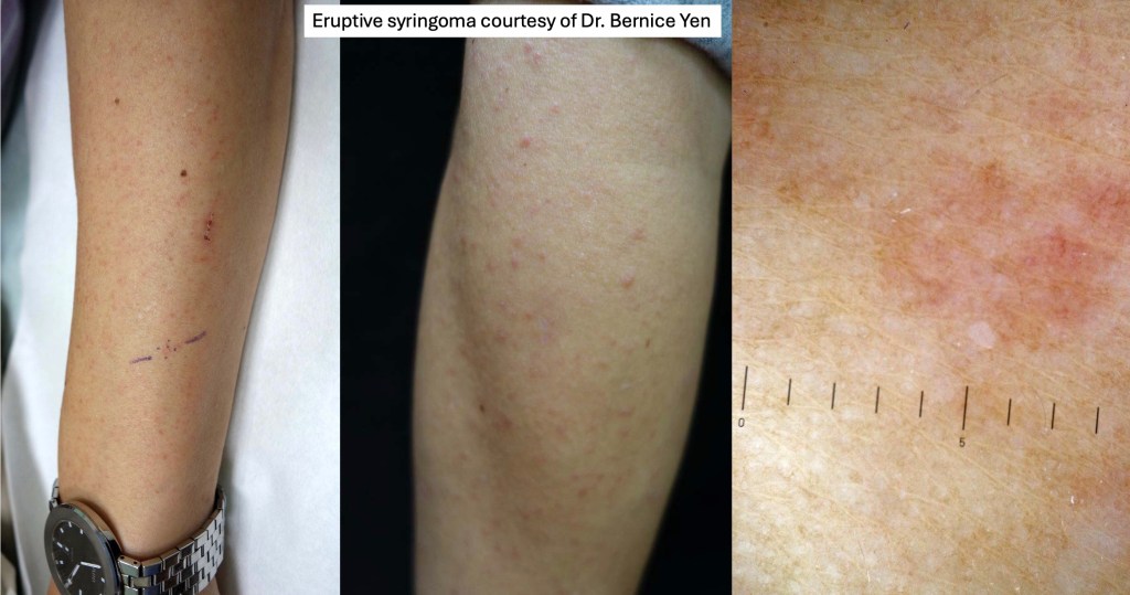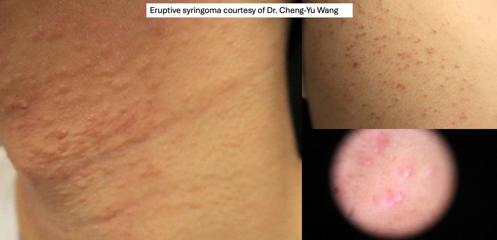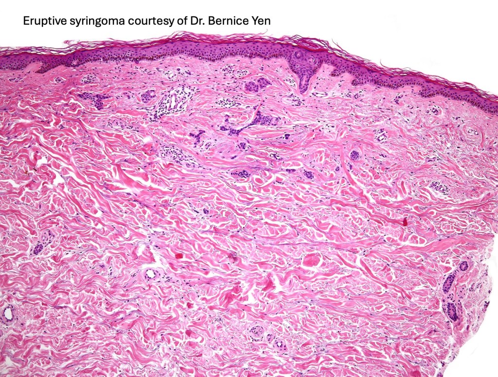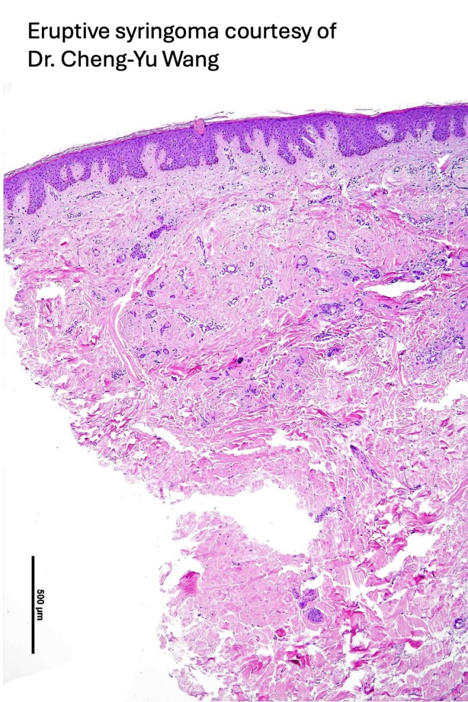•Eruptive milium-like syringoma characterized by a superficial keratin filled cyst associated with an underlying syringoma