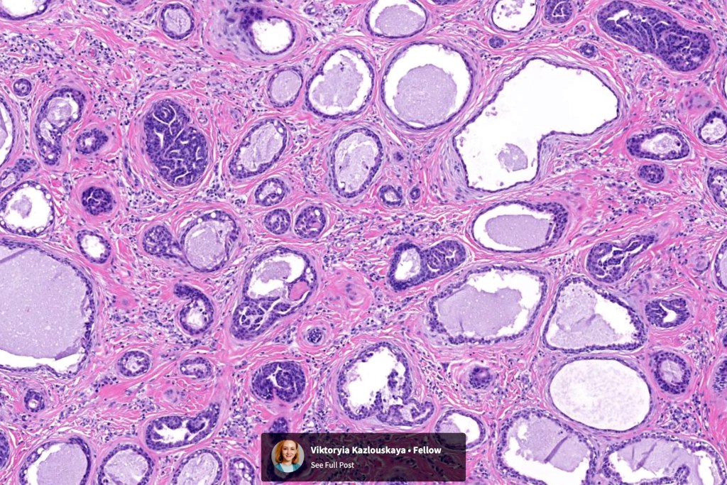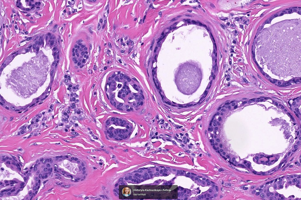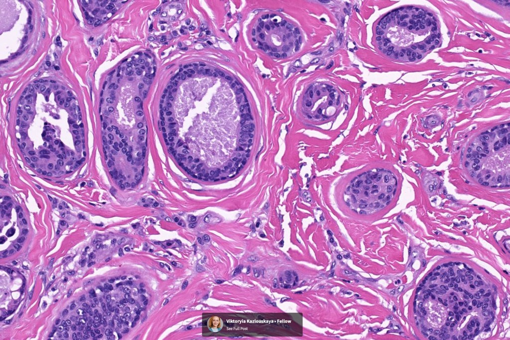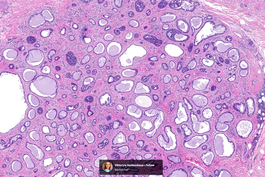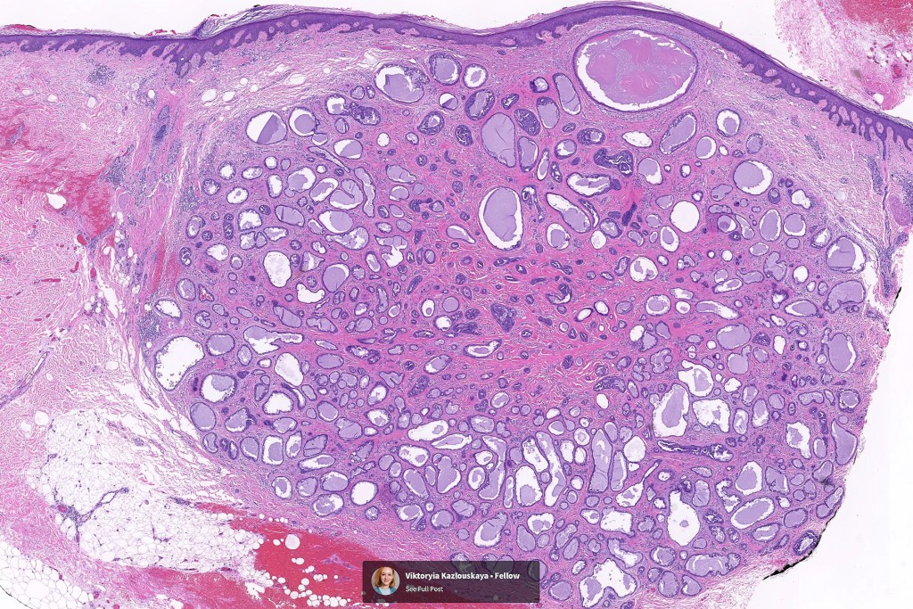 •Circumscribed nodule composed of ducts & cysts embedded in a dense fibrous stroma sometimes associated with lymphoid aggregates/germinal centers