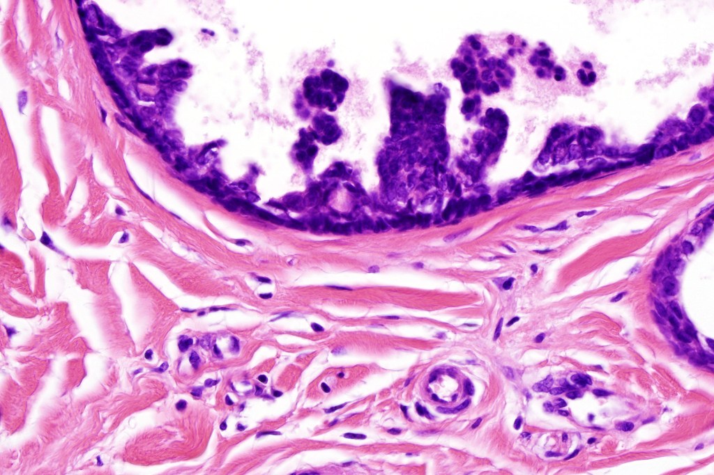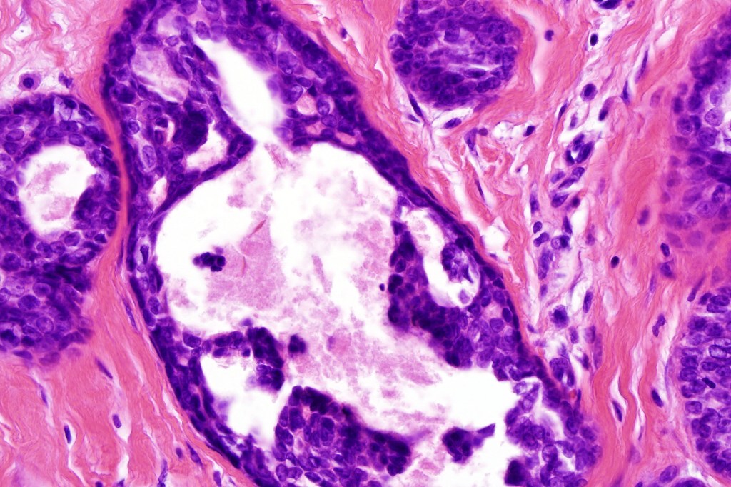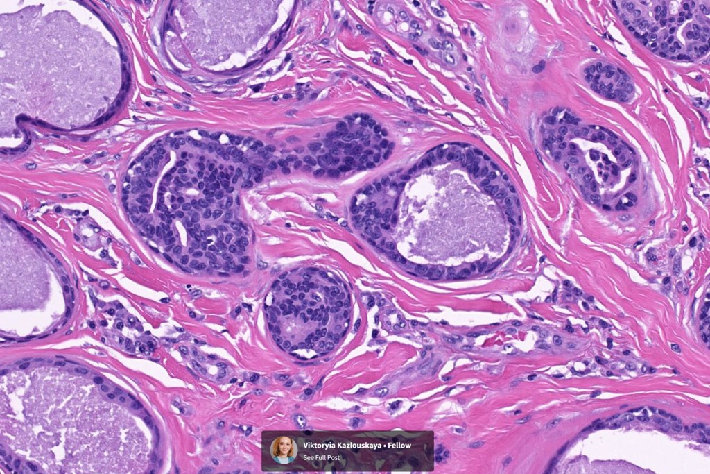 •Ducts lined by double-layered epithelium- small inner, uniform cells with eosinophilic cytoplasm & vesicular/hyperchromatic nuclei with small nucleoli & outer myoepithelial cells