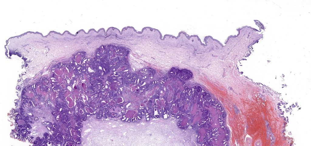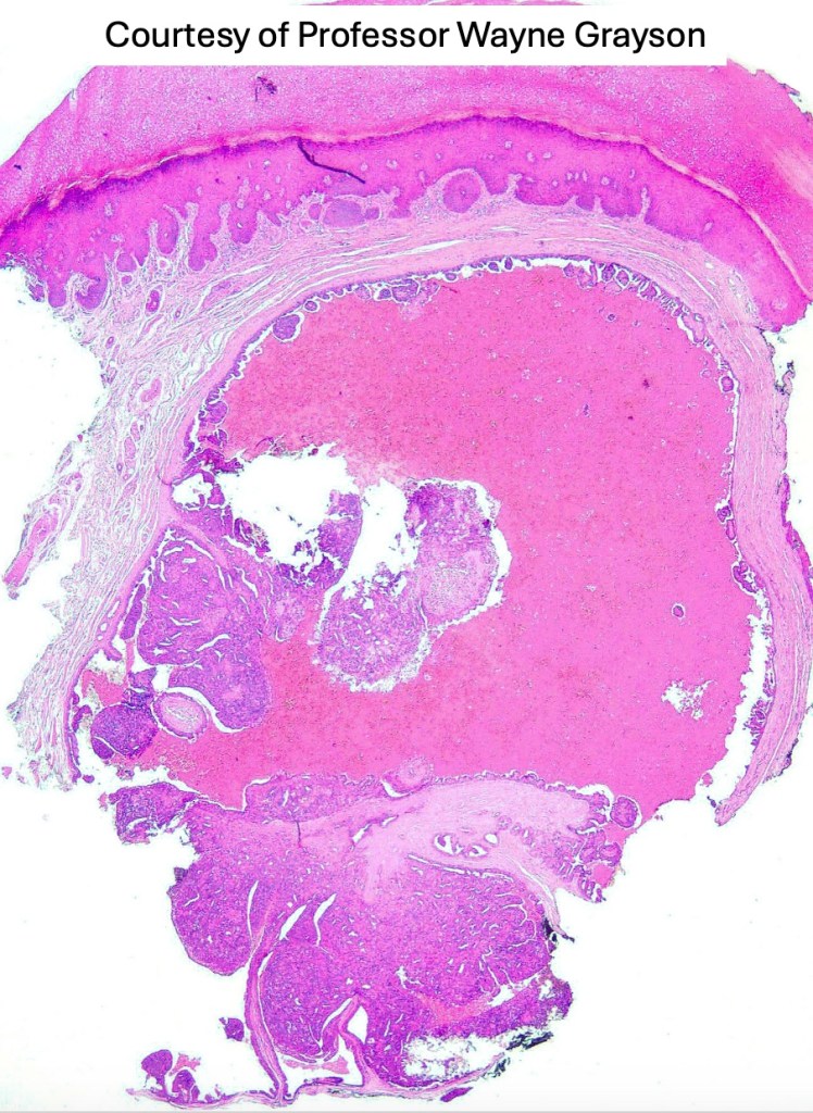 •Frequently circumscribed solid/cystic dermal nodule, infiltrative margin rare