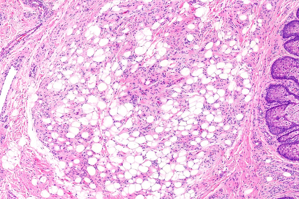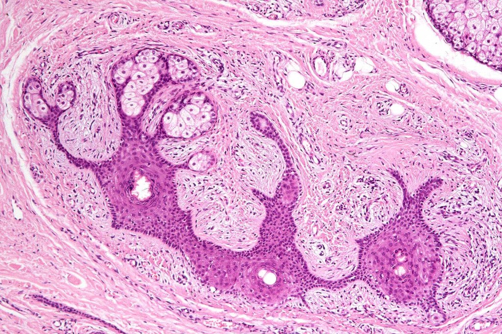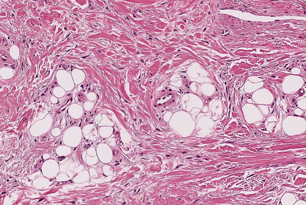 Folliculosebaceous cystic hamartoma can be distinguished from trichofolliculoma/sebaceous trichofolliculoma by the striking connective component and retraction artifact.