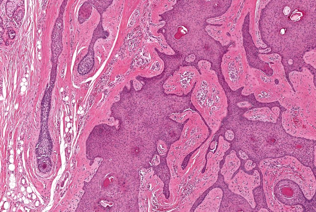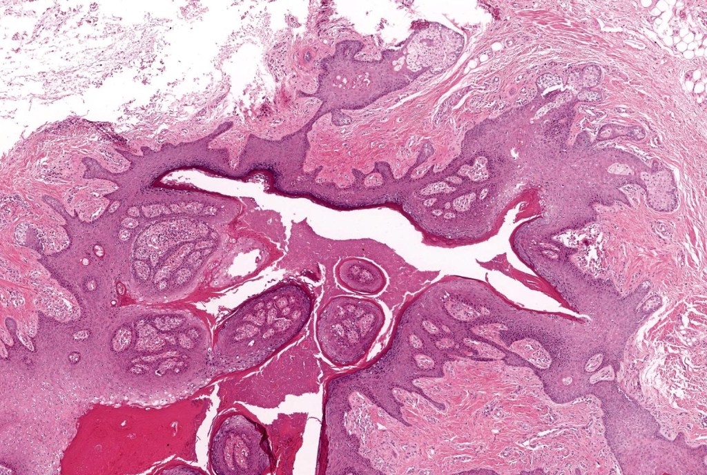 •An infundibular cyst is surrounded by laminated dermal collagen, elastic fibers, blood vessels, adipocytes & spindle cells separated from the adjacent dermis by a retraction artifact
