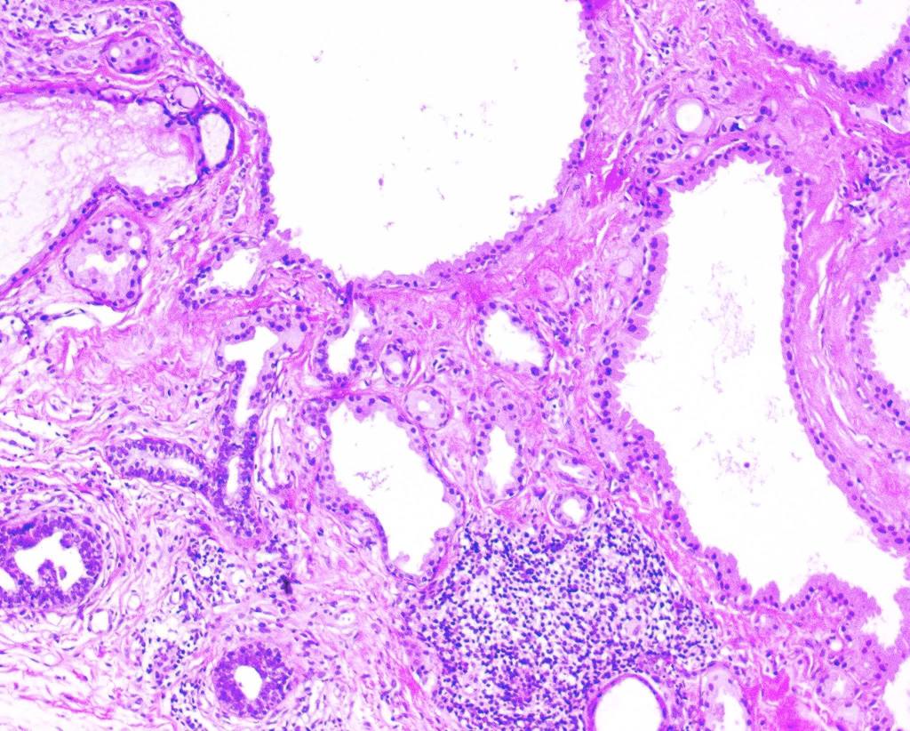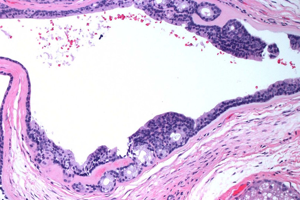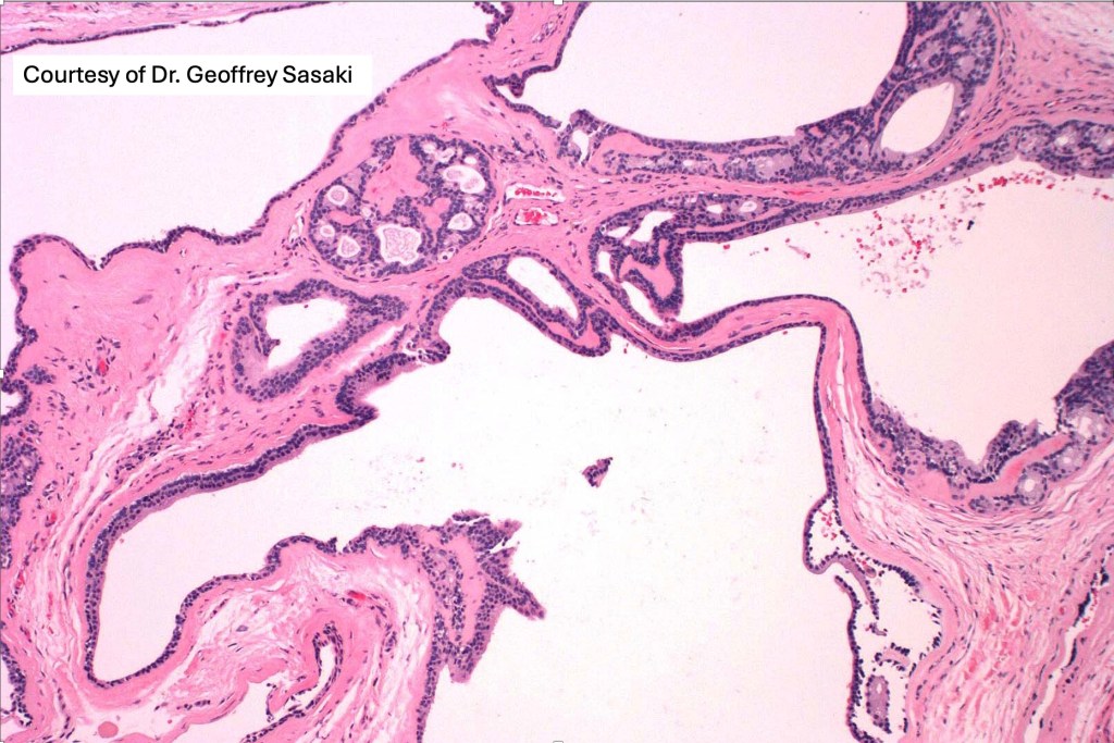 •Outer myoepithelial cells & inner layer of columnar cells with eosinophilic cytoplasm showing decapitation secretion