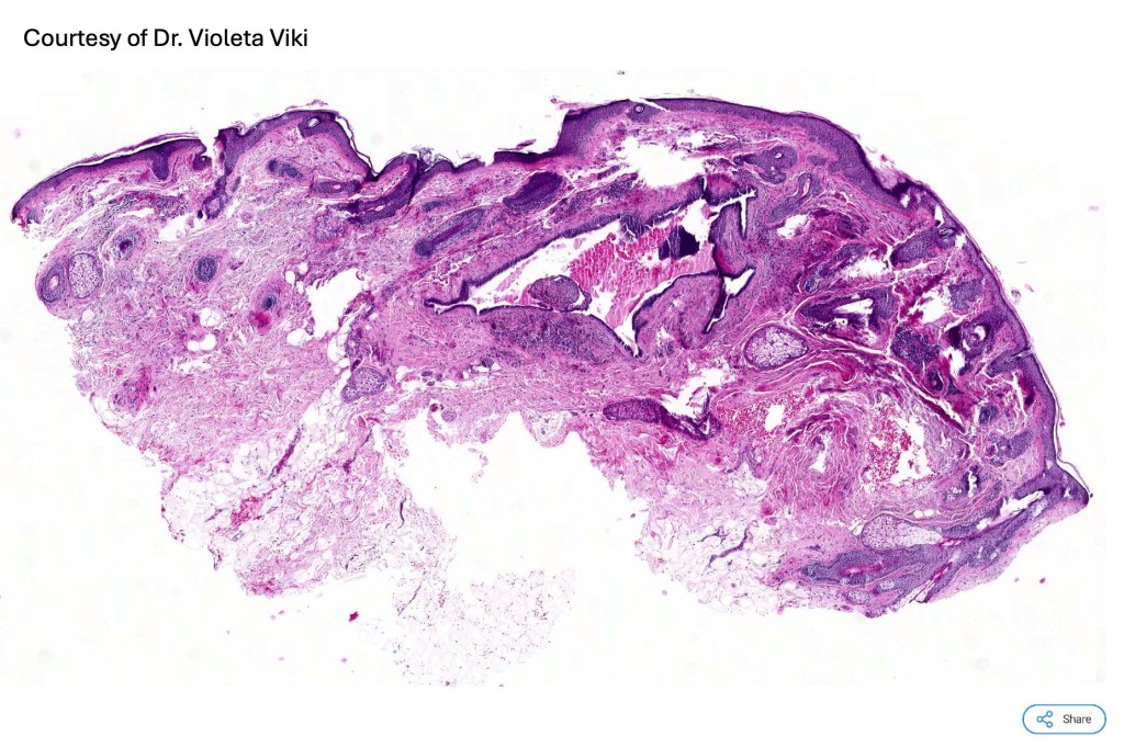 •Dome-shaped, translucent, bluish/purple/black cystic nodule measuring up to 1.0-1.5 cm