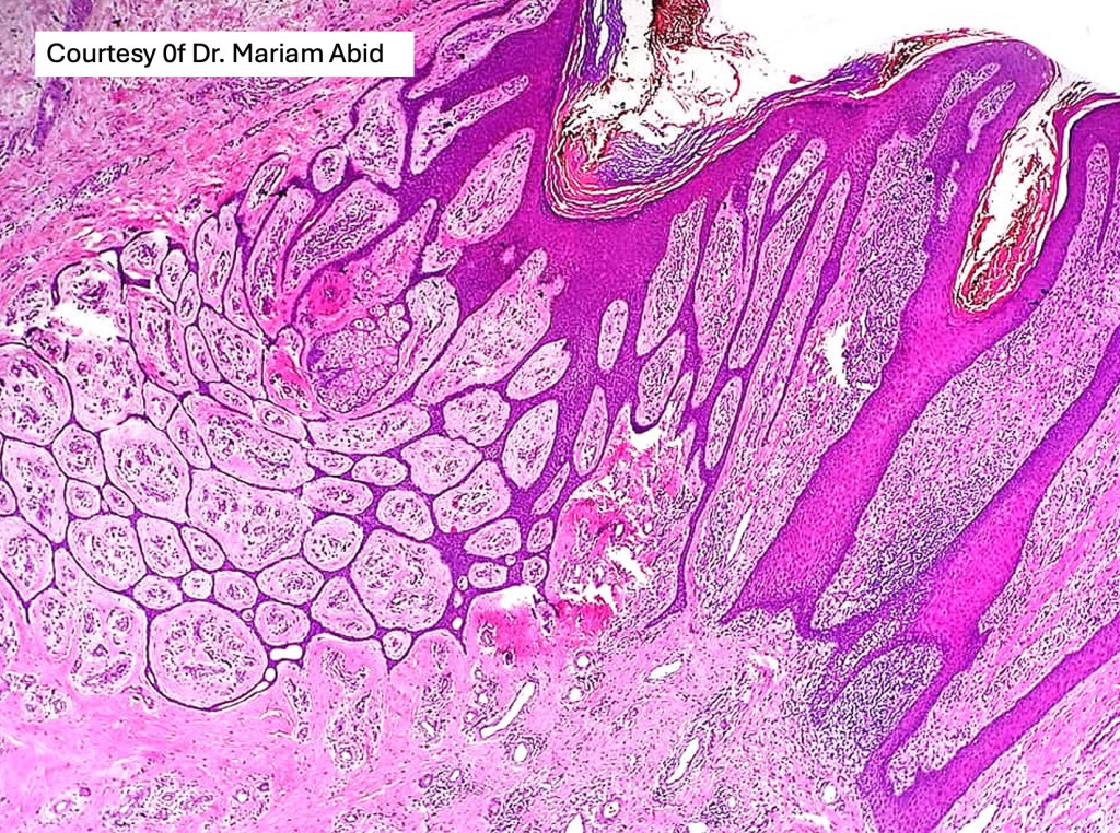 •Arising from the epidermis are multiple thin anastomosing strands of epithelium showing focal ductal differentiation