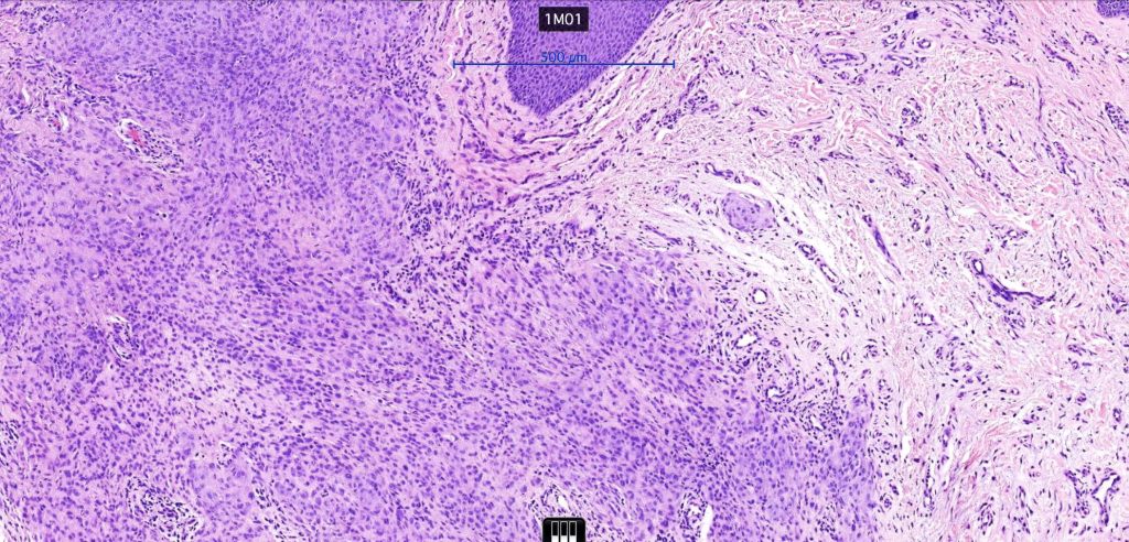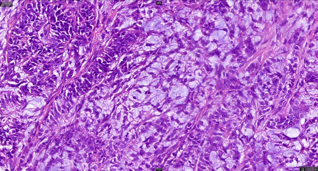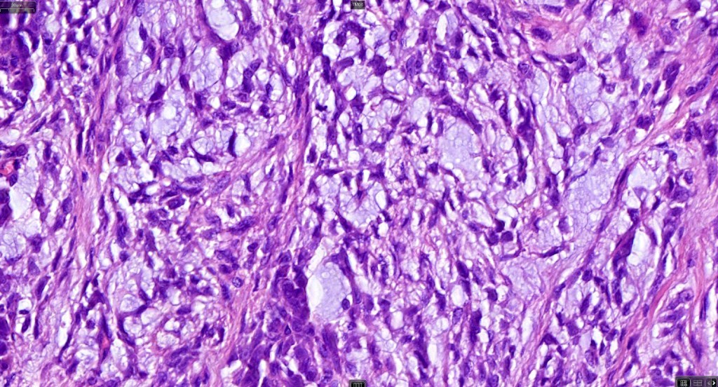 •In malignant myoepithelioma there is an infiltrating border, marked pleomorphism, high mitotic rate & necrosis. Perineural infiltration & lymphovascular invasion may be seen