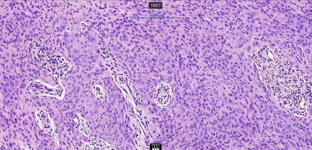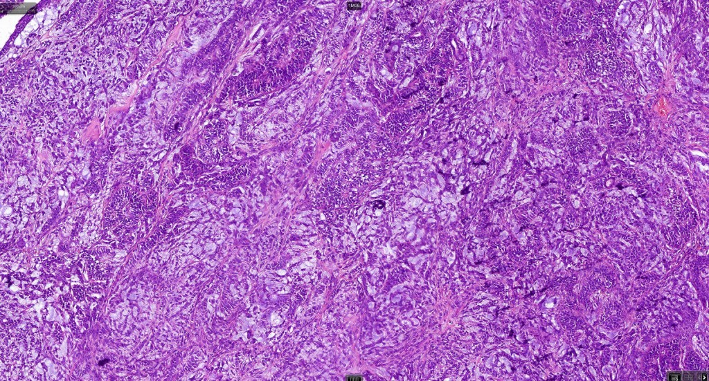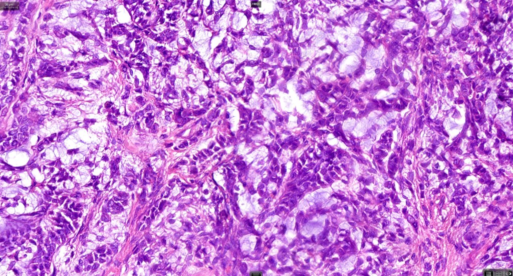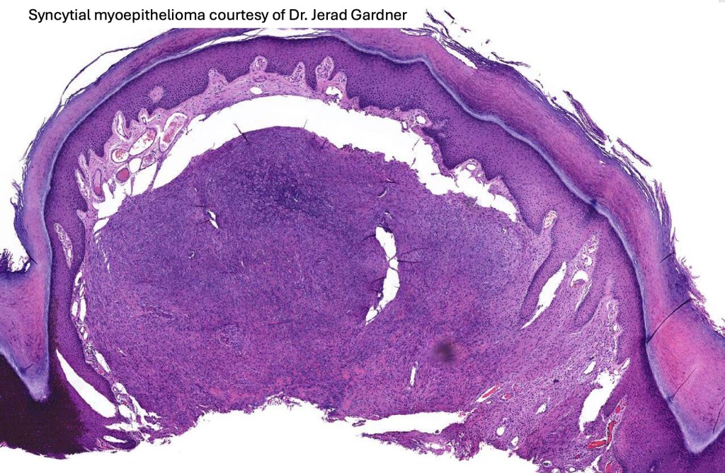 •Syncytial myoepithelioma characterized by sheet-like growth of ovoid to spindle cells with pale cytoplasm, syncytial borders & vesicular nuclei