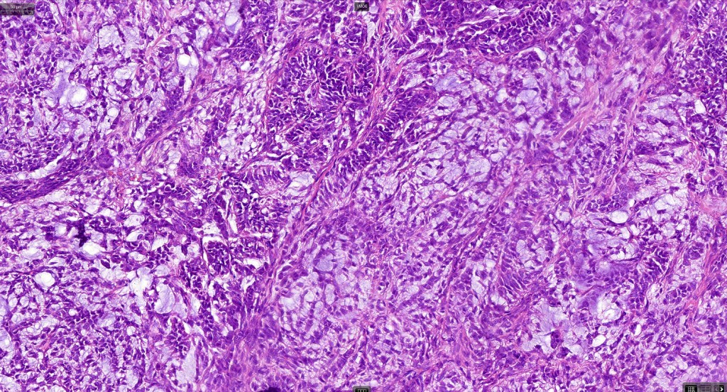 •Pure population of myoepithelial cells dispersed in sheet-like, reticular, whorled or fascicular patterns in a myxoid or hyaline stroma
