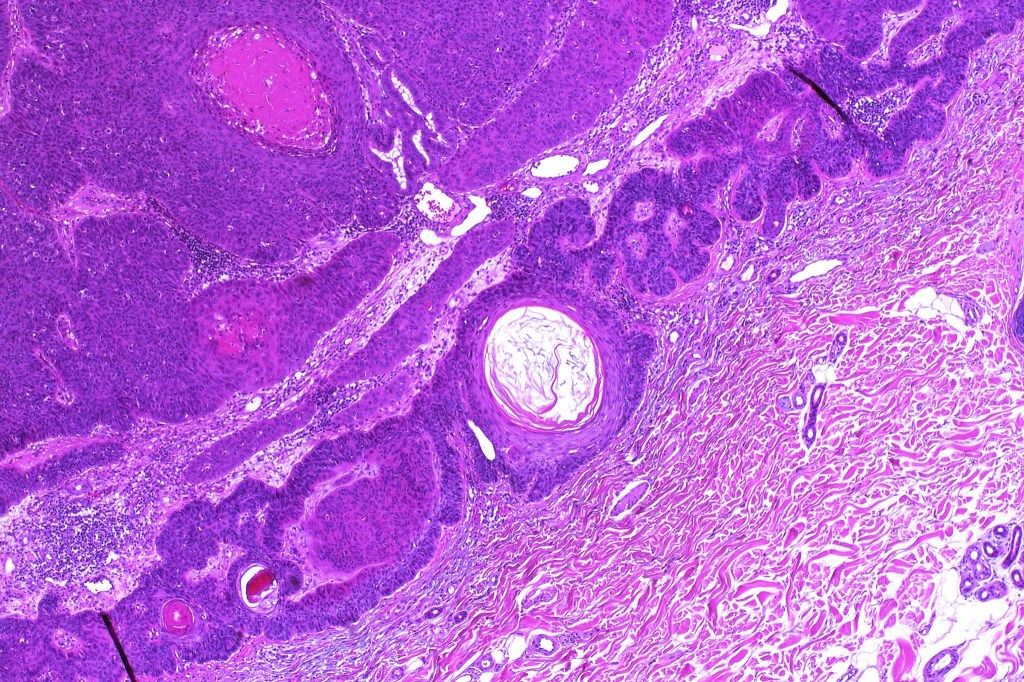 For comparison an actholytic squamous cell carcinoma- in cases of doubt, IHC and special stains for mucin will resolve the problem.