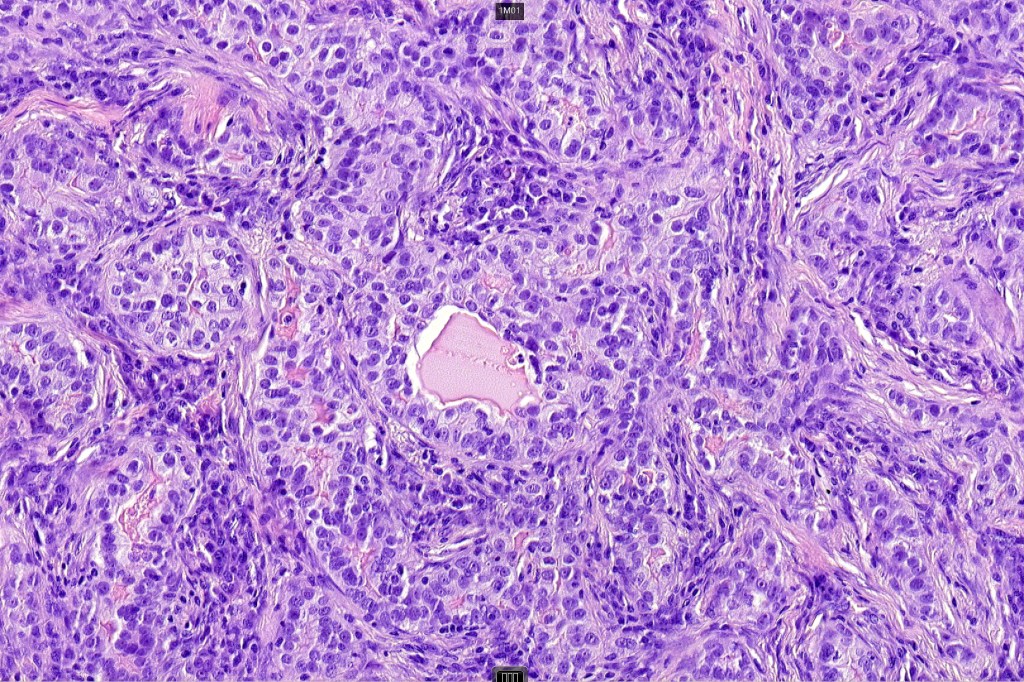 •Glandular foci show mucin