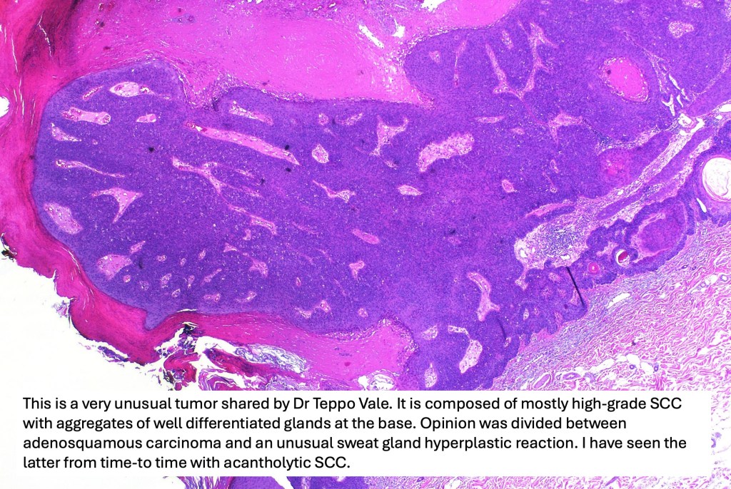 •Should be distinguished from pseudoglandular (acantholytic) SCC & metastatic adenosquamous carcinoma e.g. respiratory tract, bile duct, prostate, colon, cervix etc