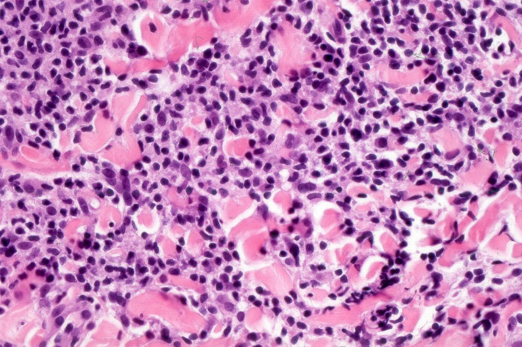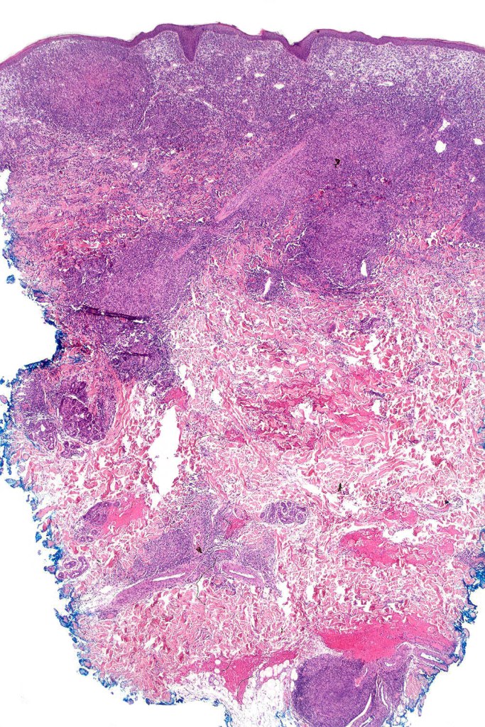 •Established lesions are readily recognizable & characterized by a dense infiltrate throughout the dermis &extending into subcutaneous fat
