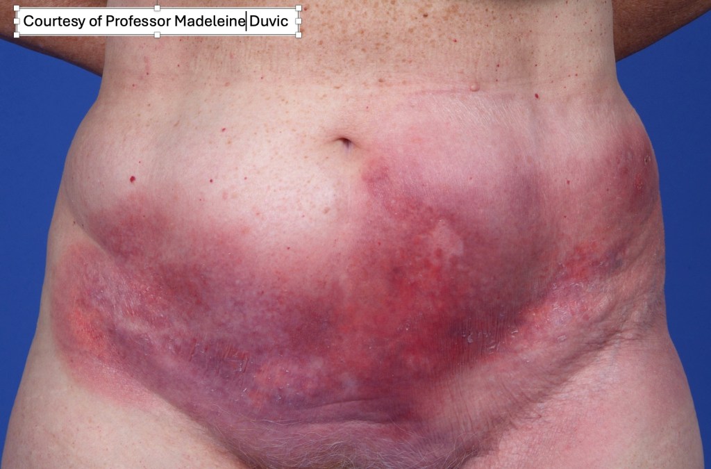 •Presents with erythematous papules & plaques which slowly  progress to distinctive, large, atrophic, pendulous plaques due atrophy and to loss of elastic tissue