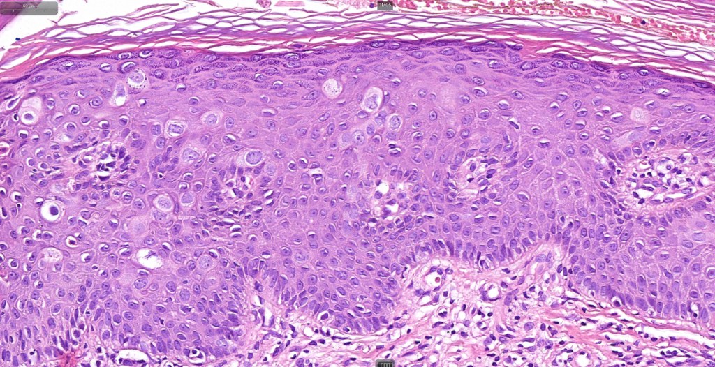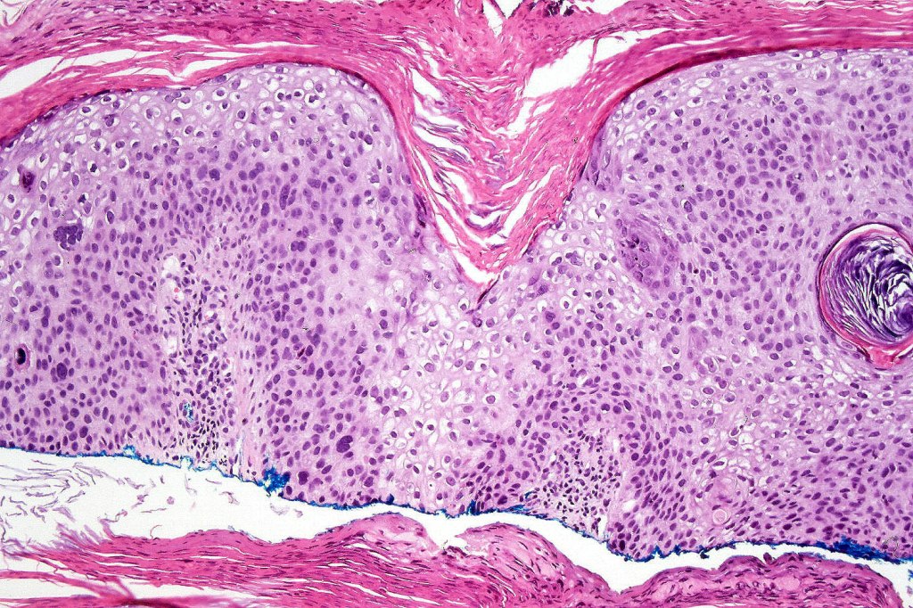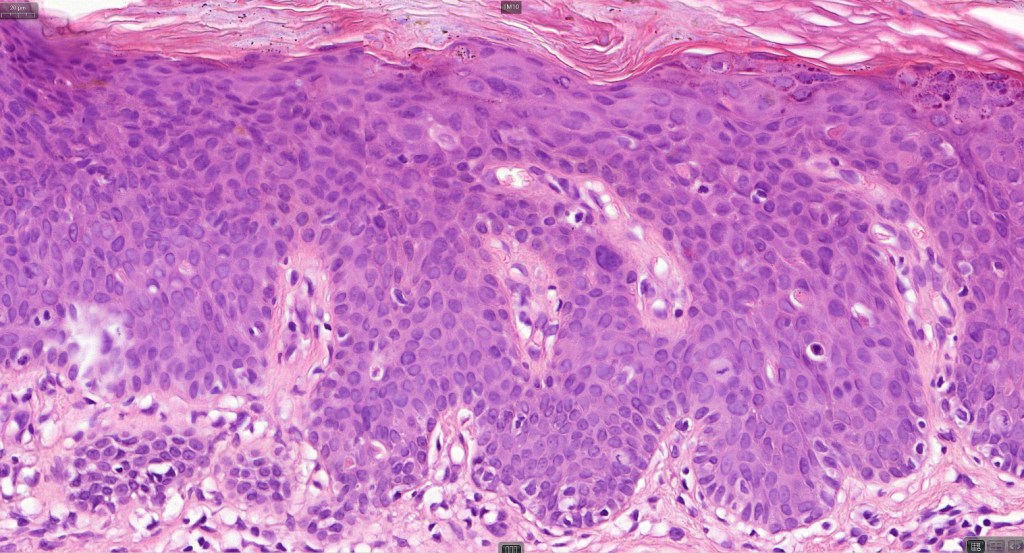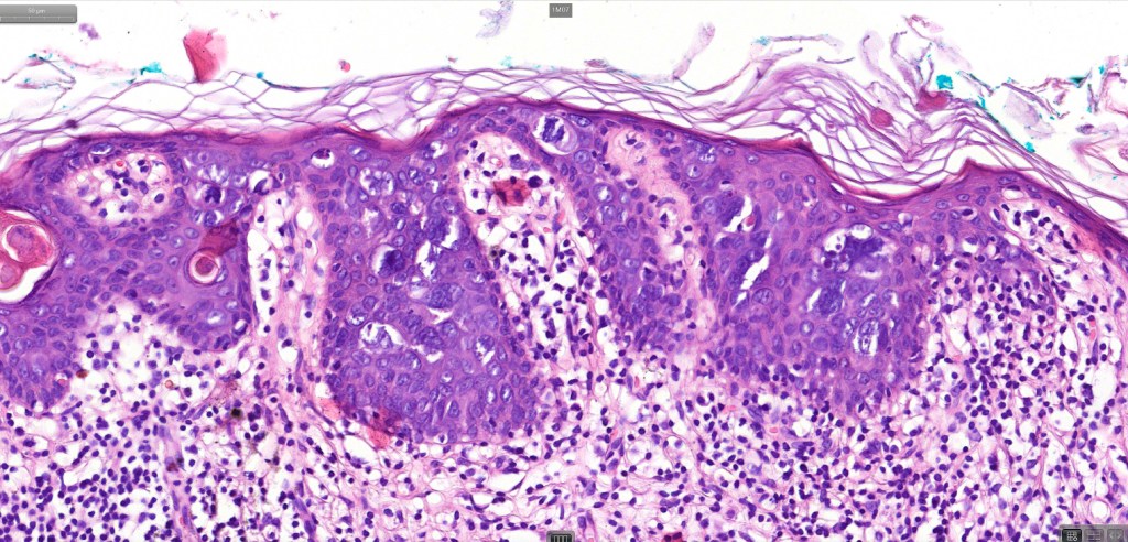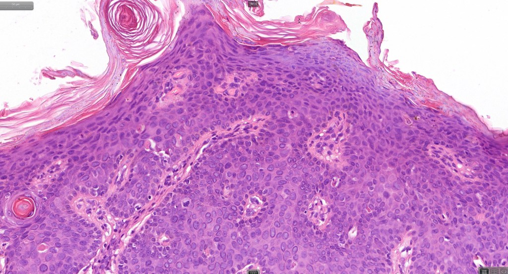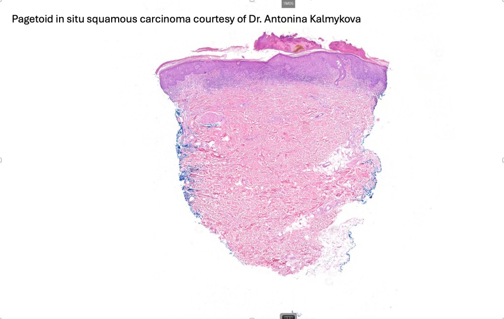 •Full thickness dysplasia (carcinoma in situ) involving the epidermis and intraepidermal adnexal elements