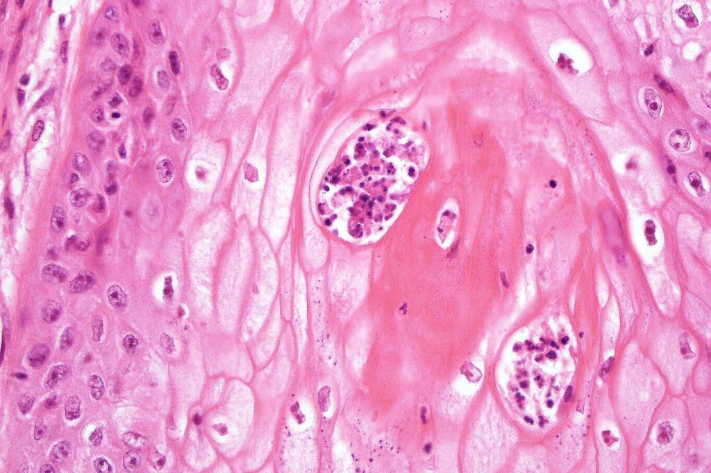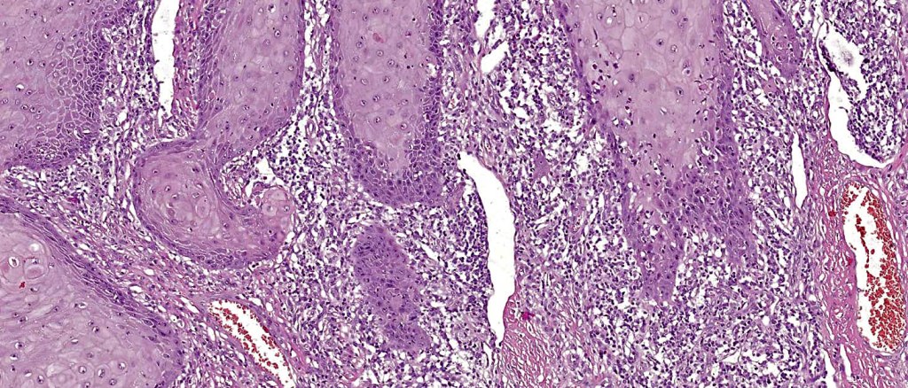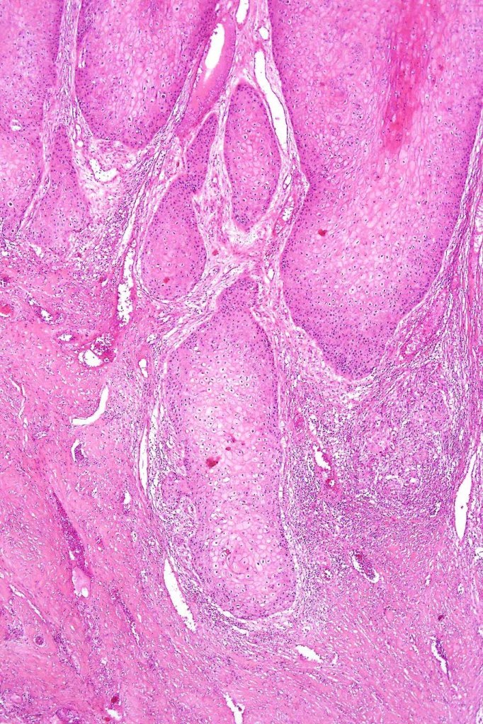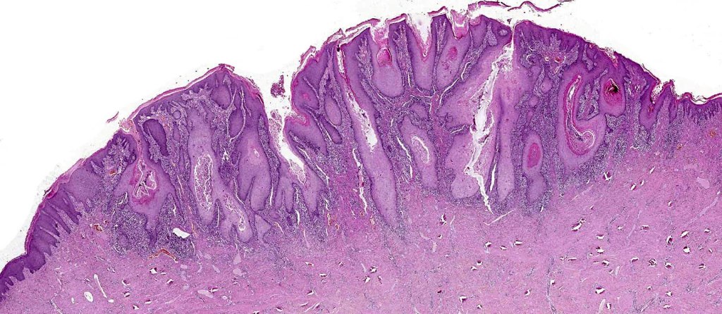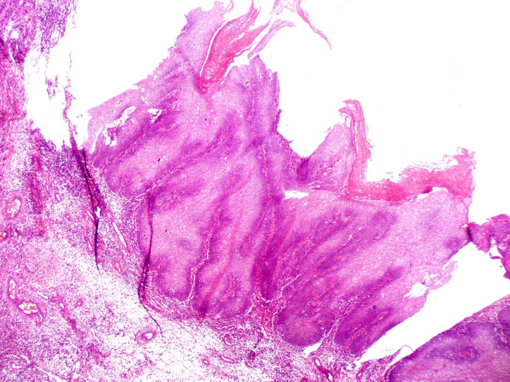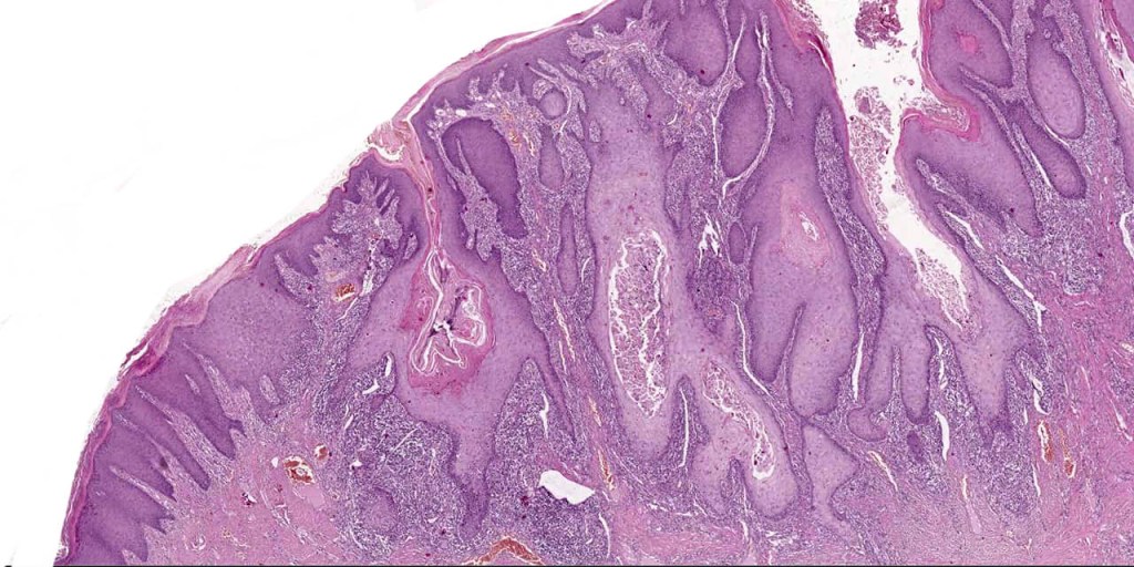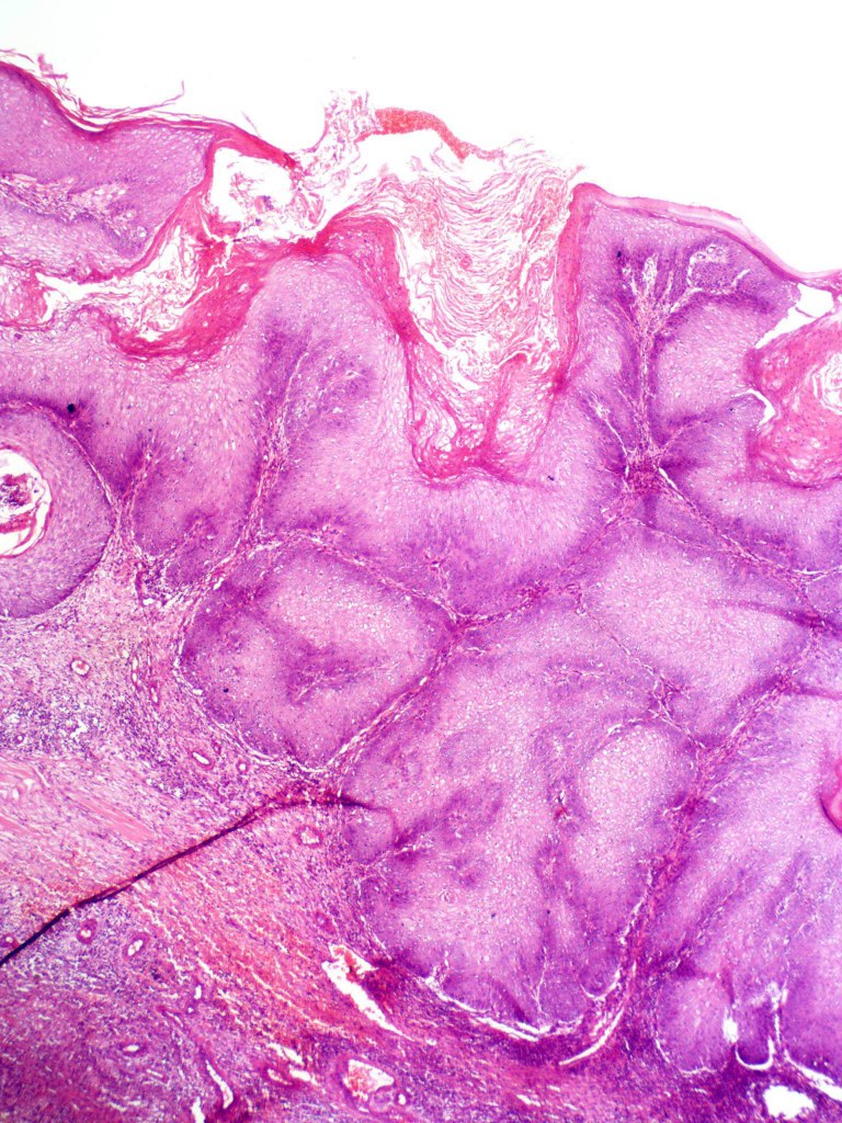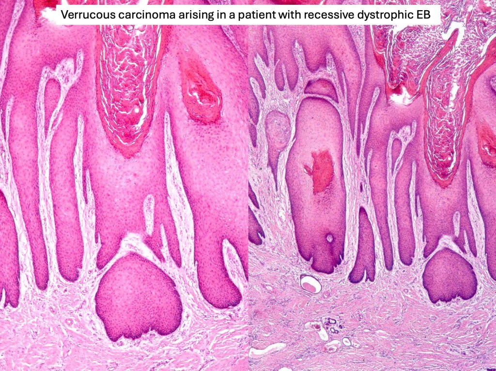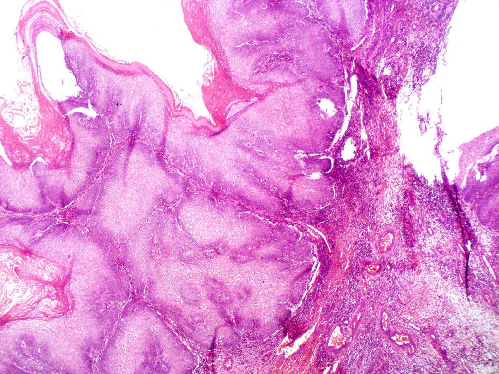 Verrucuous carcinoma must be distinguished from a viral wart, pseudoepitheliomatous hyperplasia and well differentiated squamous carcinoma. This can be very difficult if only superficial biopsies are available for study. Distinction from a plantar wart is sometimes very problematical since some verrucous carcinomas are associated with HPV infection. Well differentiated squamous carcinoma has an infiltrating rather than a pushing lower border. Clinicopathological correlation is essential in problematical cases.